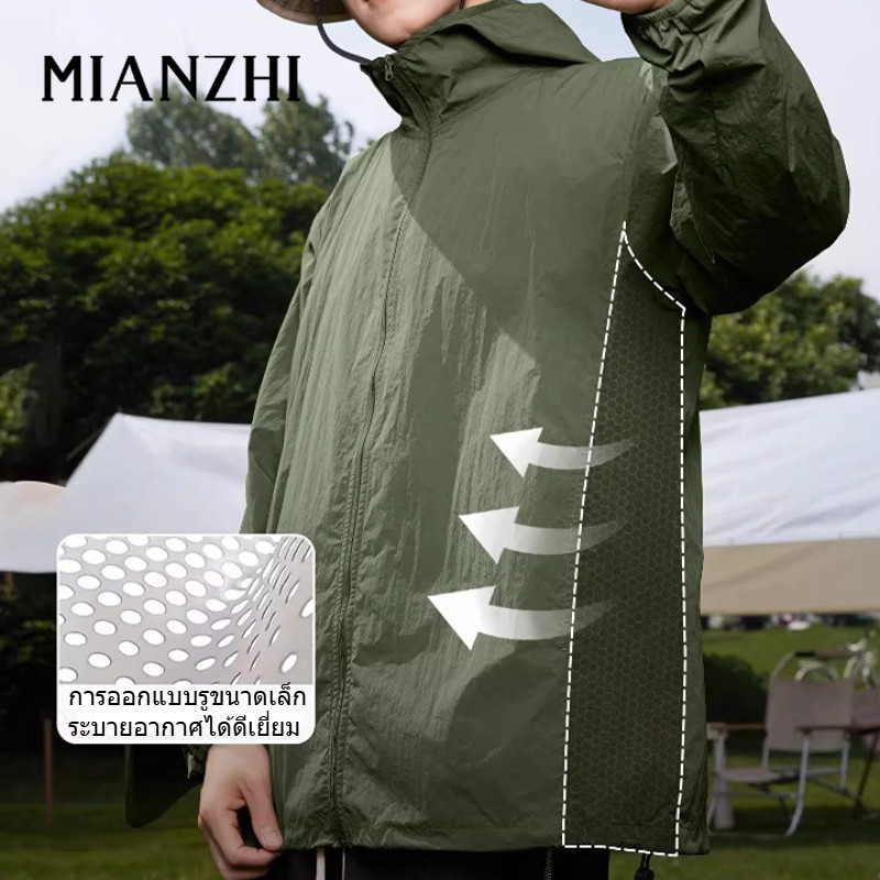 MIANZHI UPF50+ เสื้อแจ็คเก็ตกันแดดมีฮู้ดสำหรับผู้ชาย ผ้าไหมน้ำแข็ง น้ำหนักเบาและระบายอากาศได้ ป้องกันรังสียูวี เสื้อผ้าผิวแห้งเร็ว เหมาะสำหรับฤดูร้อน M-4XL