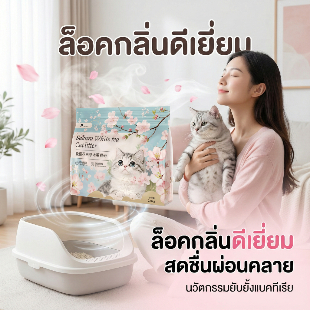 [ซื้อ 3 แถม 1] ทรายแมวมันสำปะหลัง กลิ่นซากุระชาขาว จับตัวเป็นก้อนไว ดับกลิ่นดีเยี่ยม แถมฟรี! ที่ตักท