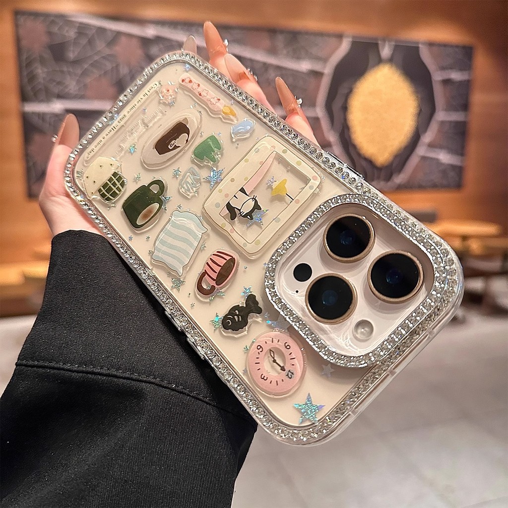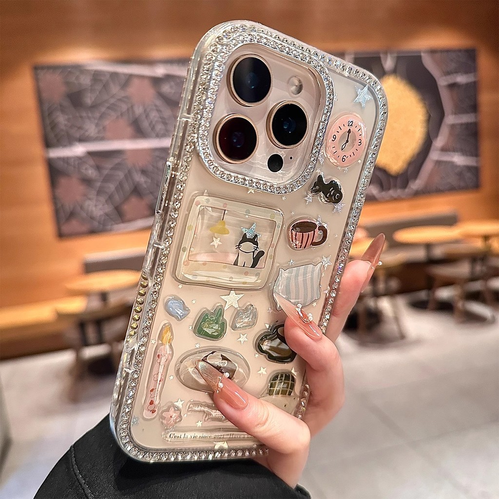 เพชรเลนส์กรอบ 3D หมอนแมว Glitter Star อะคริลิคโปร่งใสเคสโทรศัพท์สําหรับ iPhone 17Promax 16Promax 11 12 13 14 15 Pro Max 15Plus หวาน Girly กันกระแทกฝาครอบมือถือ