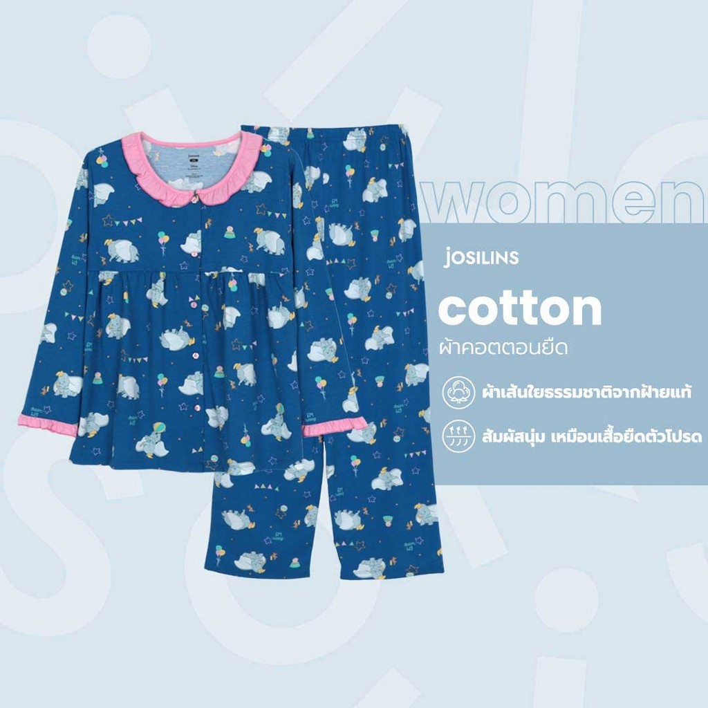 Josilins ชุดนอน ชุดอยู่บ้าน ผู้ใหญ่ ลิขสิทธิ์ Disney Dumbo ลาย สวนสนุก คอระบาย แขนยาว ขายาว ผ้ายืด ไซซ์ SM