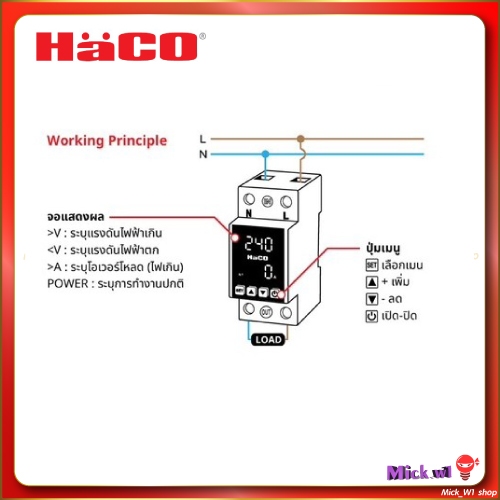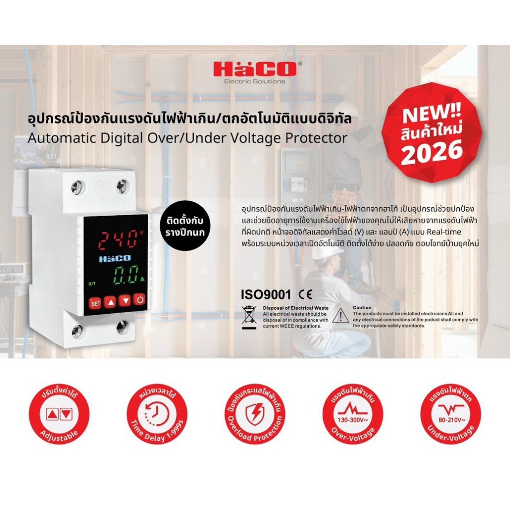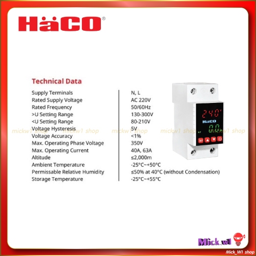 HACO อุปกรณ์ป้องกันแรงดันไฟฟ้าเกิน/ตกอัตโนมัติแบบดิจิทัล 1Phase 130~300V รุ่น OUN-VOL 40A และ 63A