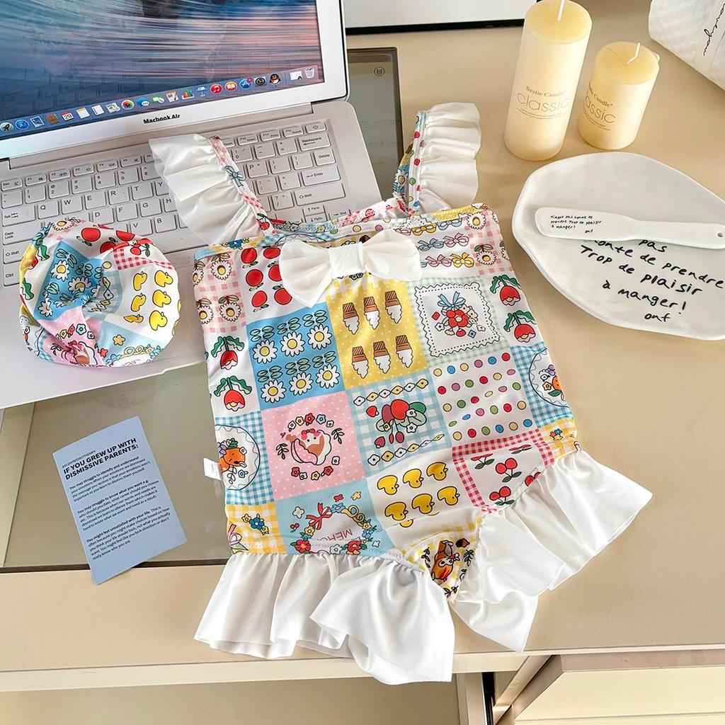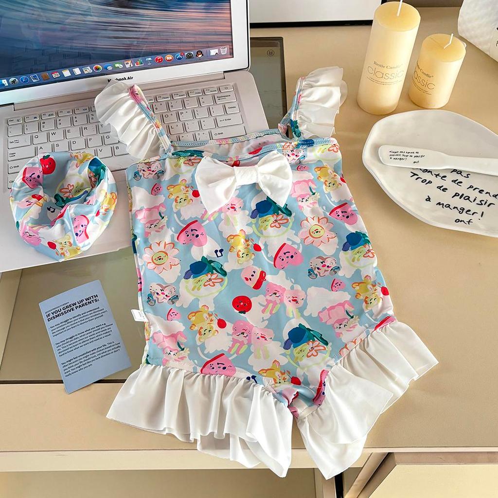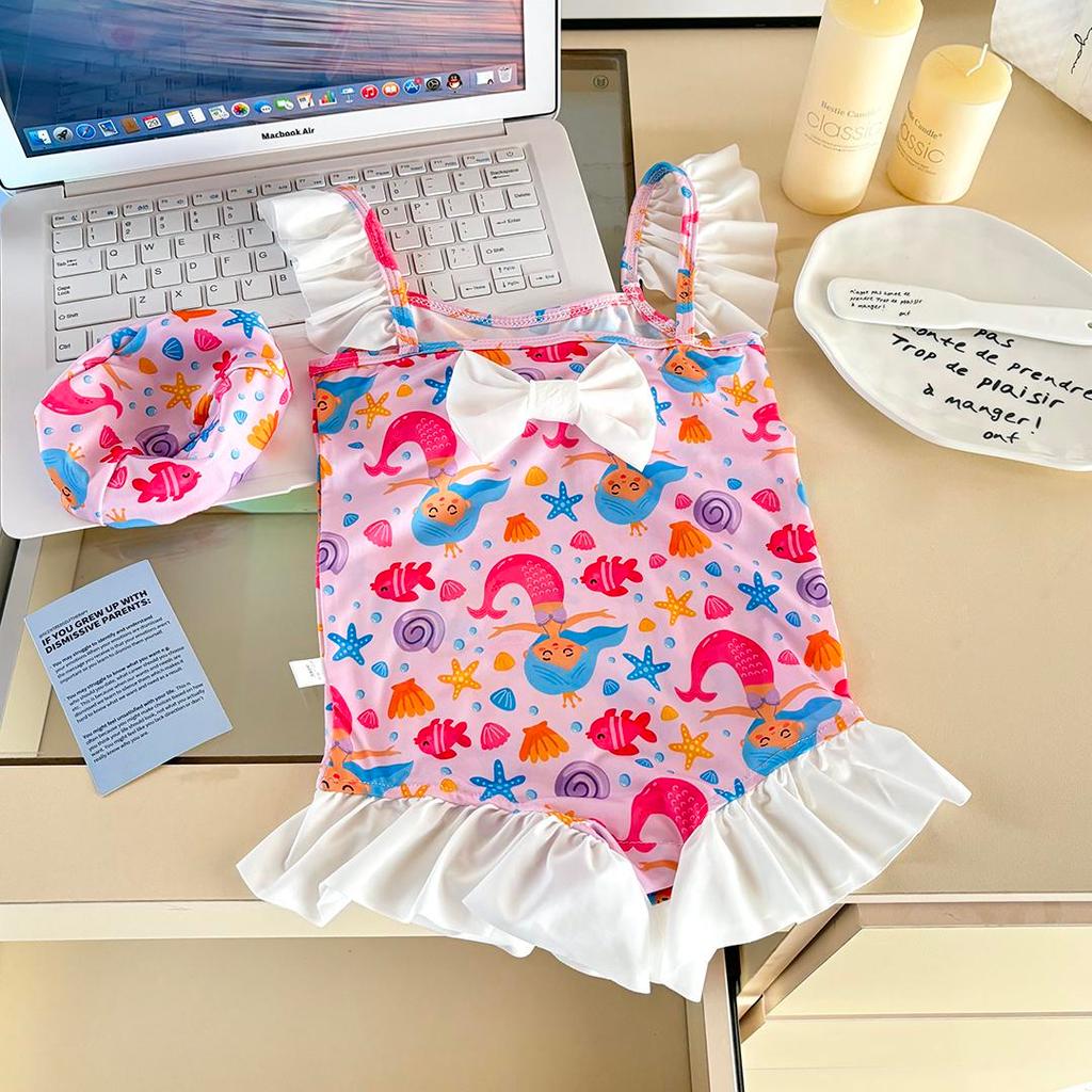 MooDeng Baby ชุดว่ายน้ำเด็ก+หมวกคลุมหัว ลายน่ารัก มีโบว์ หน้า-หลัง วันพีซ สำหรับเด็กหญิง ผ้าไนลอน