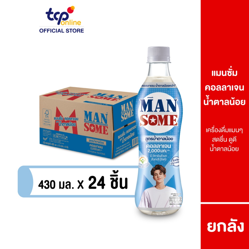 [รวมส่ง] แมนซั่ม คอลลาเจน สูตรน้ำตาลน้อย 430 มล. ยกลัง 24 ขวด (TCP) Mansome Collagen Less Sugar 430 ml.