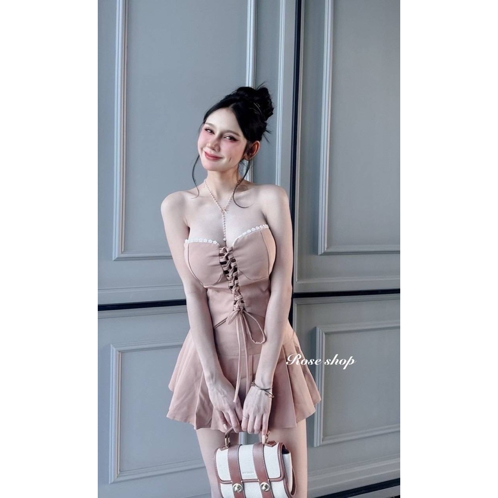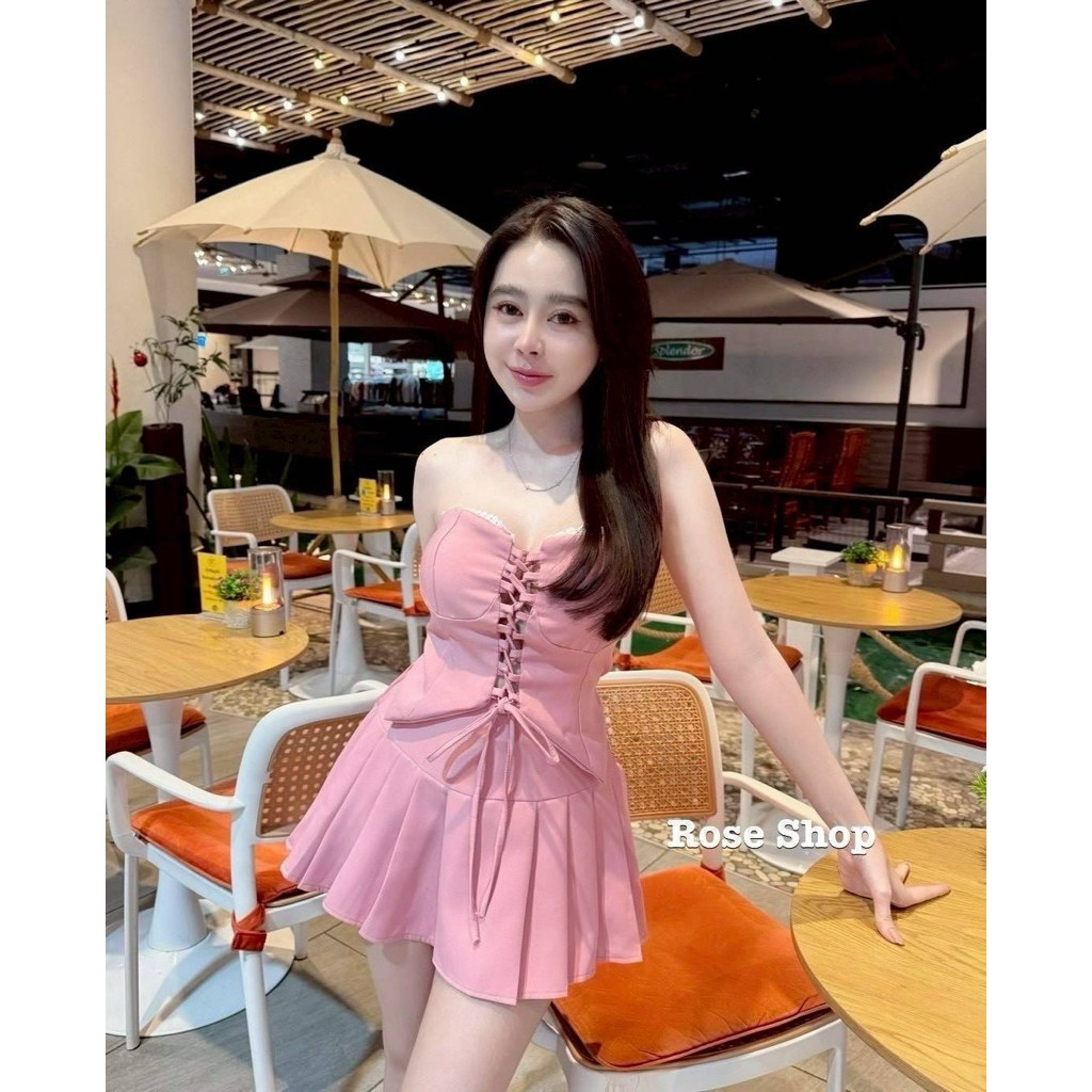 Phapassz - เซท 2 ชิ้น เกาะอกดีเทลเชือกผูกแต่งขอบลูกไม้ ผ้าสีพื้น อกเสริมฟองน้ำ กระโปรงจับจีบมีซับในตัว #Roseshop