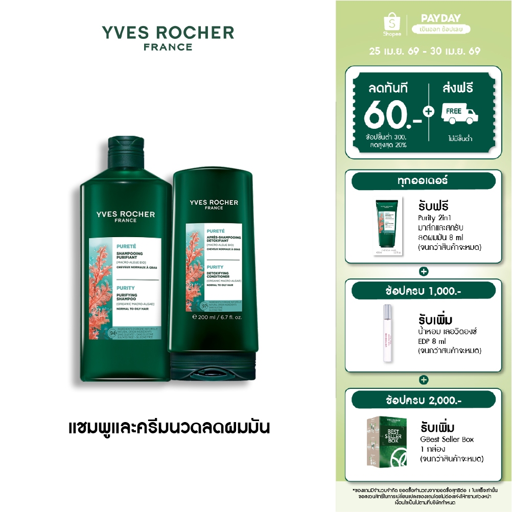 [แพ็คคู่] อีฟ โรเช Yves Roche Purity Detoxifying Shampoo 300ml. & Conditioner 200ml. แชมพู และครีมนวดสำหรับผมมัน