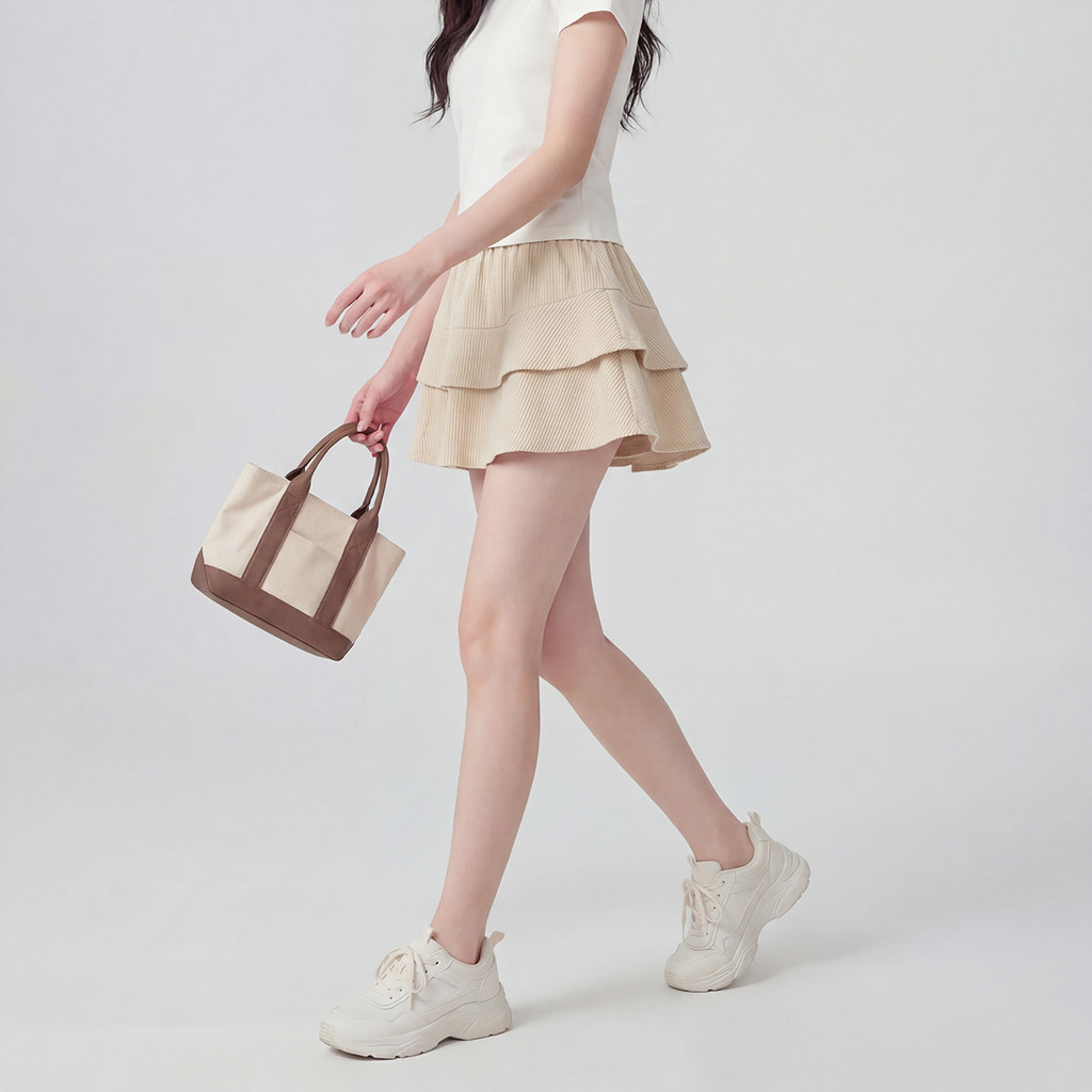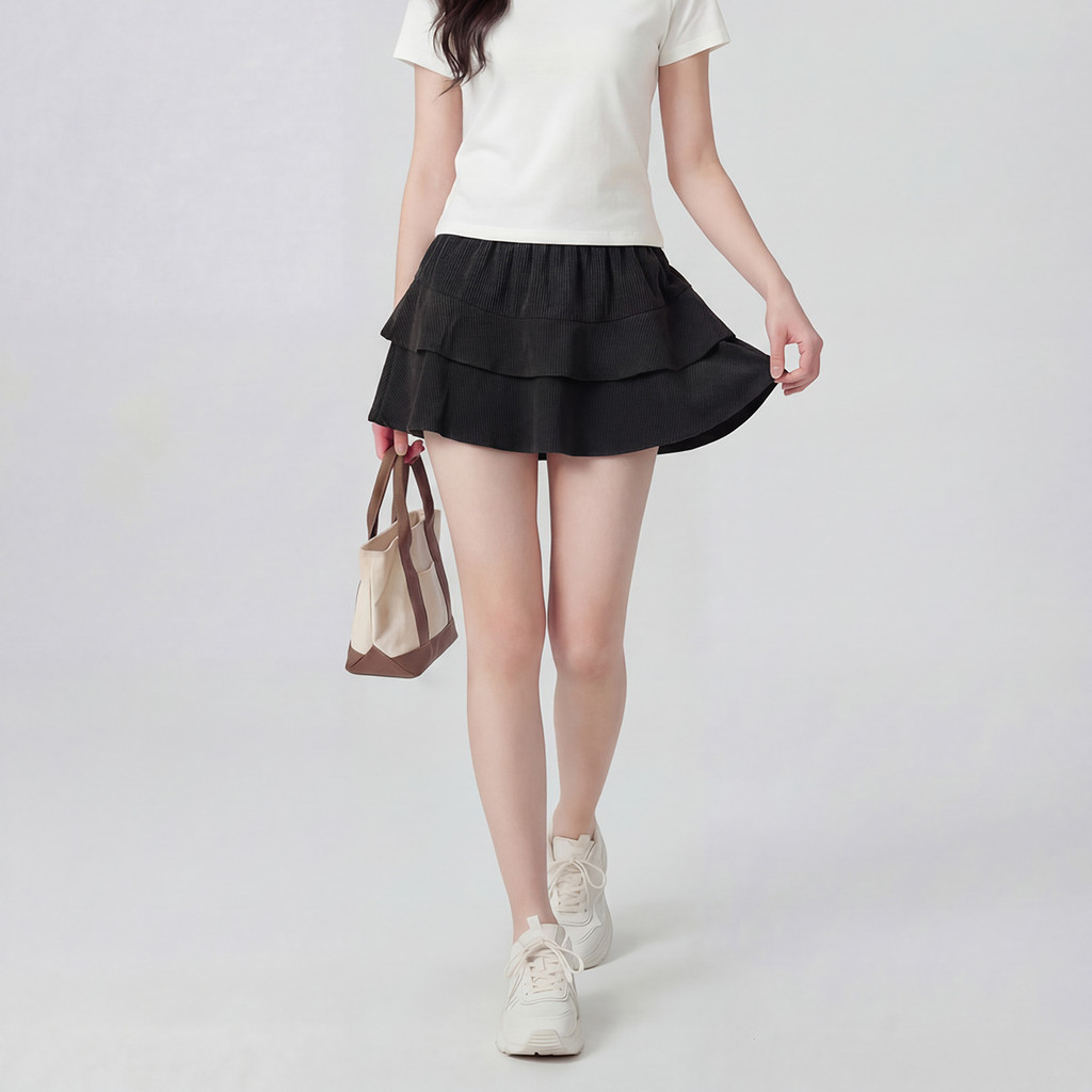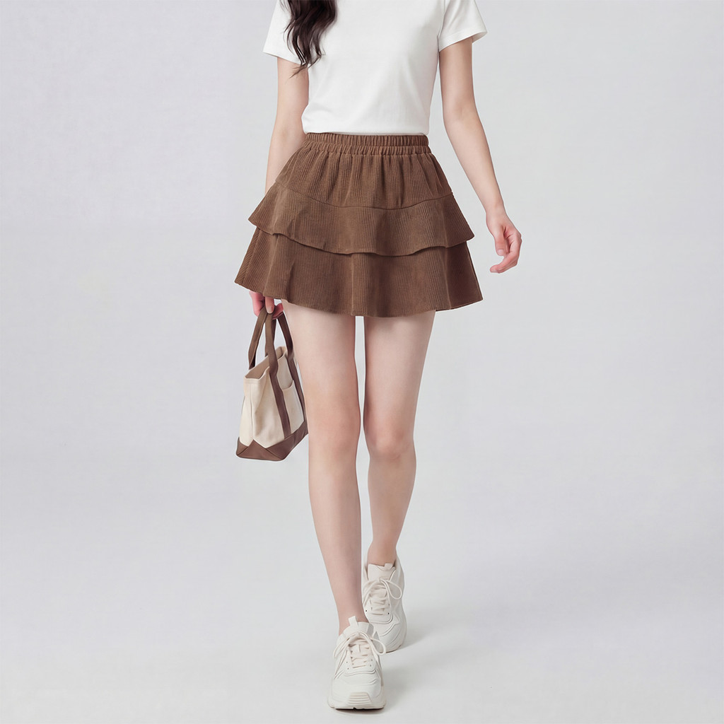 Suysuy พร้อมส่ง กระโปรงสั้น ผ้าลูกฟูก ทรงเลเยอร์ 2 ชั้น สไตล์เกาหลี แนวน่ารักเรียบง่าย มินิมอล มีซับใน เอวสม็อค