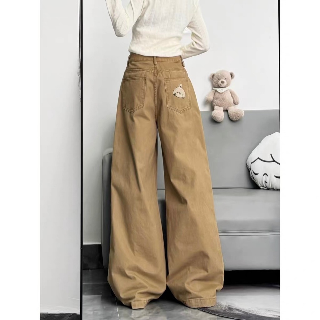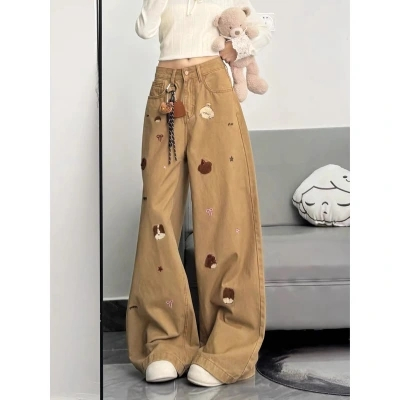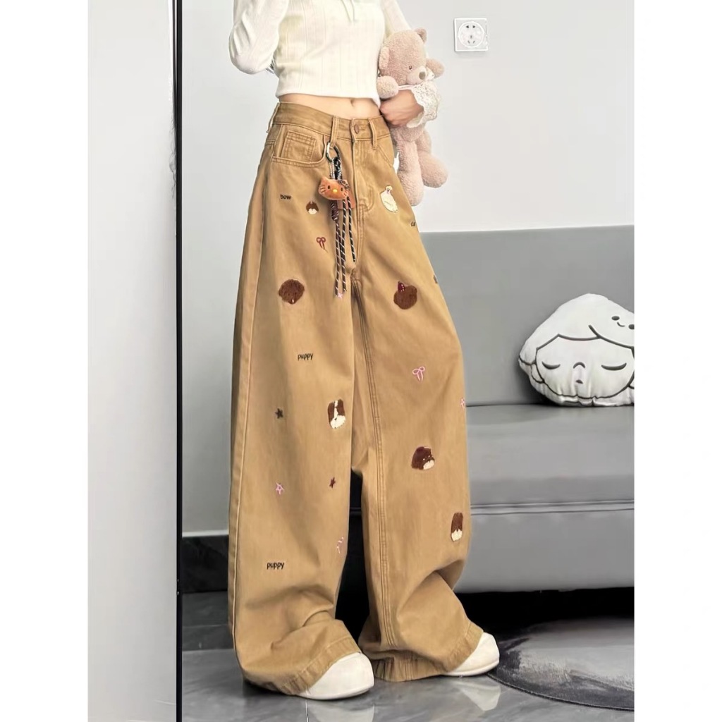 KOKOMI กางเกงยีนส์ปักสำหรับผู้หญิง เอวสูงและขากว้างหลวม