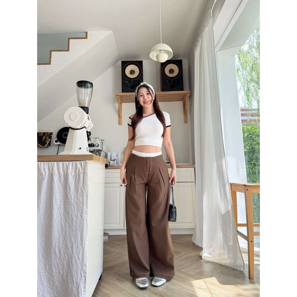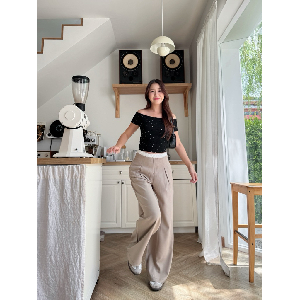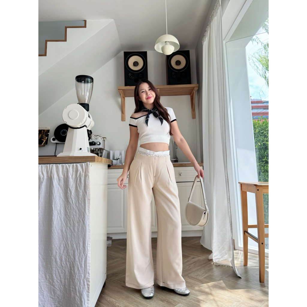 กางเกงทรงขากระบอกงานเอวกลาง ดีเทลแต่งขอบเอวลูกไม้ ซิปหลัง🍪🥞🫧