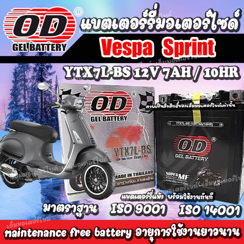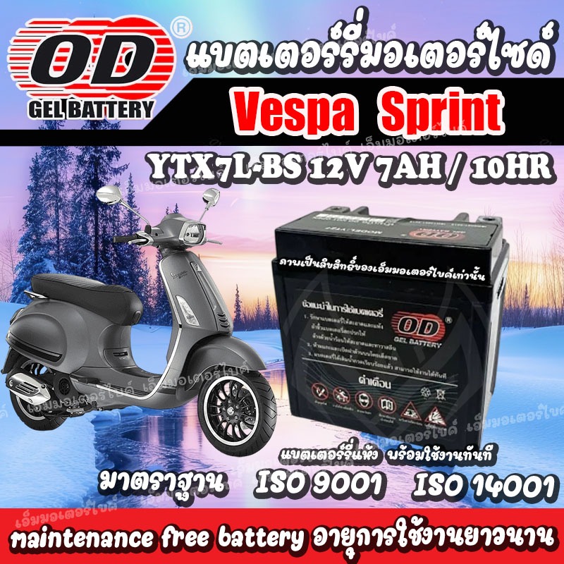 แบตเตอรี่สำหรับ Vespa Sprint ทุกรุ่น เวสป้า ยี่ห้อ OD 12V7Ah แบตvespa sprint แบตVespa sprint พร้อมใช้งานไม่ต้องชาร์จไฟ