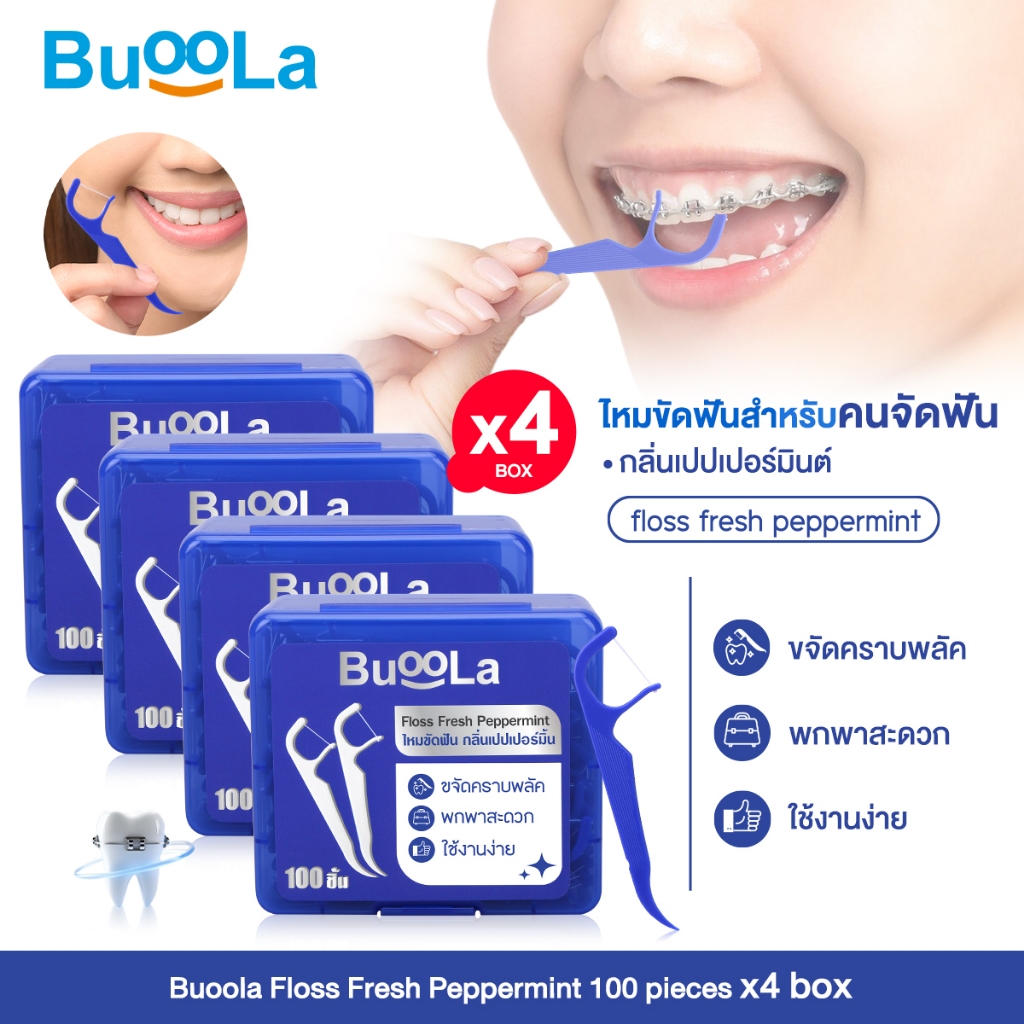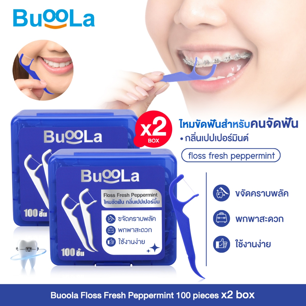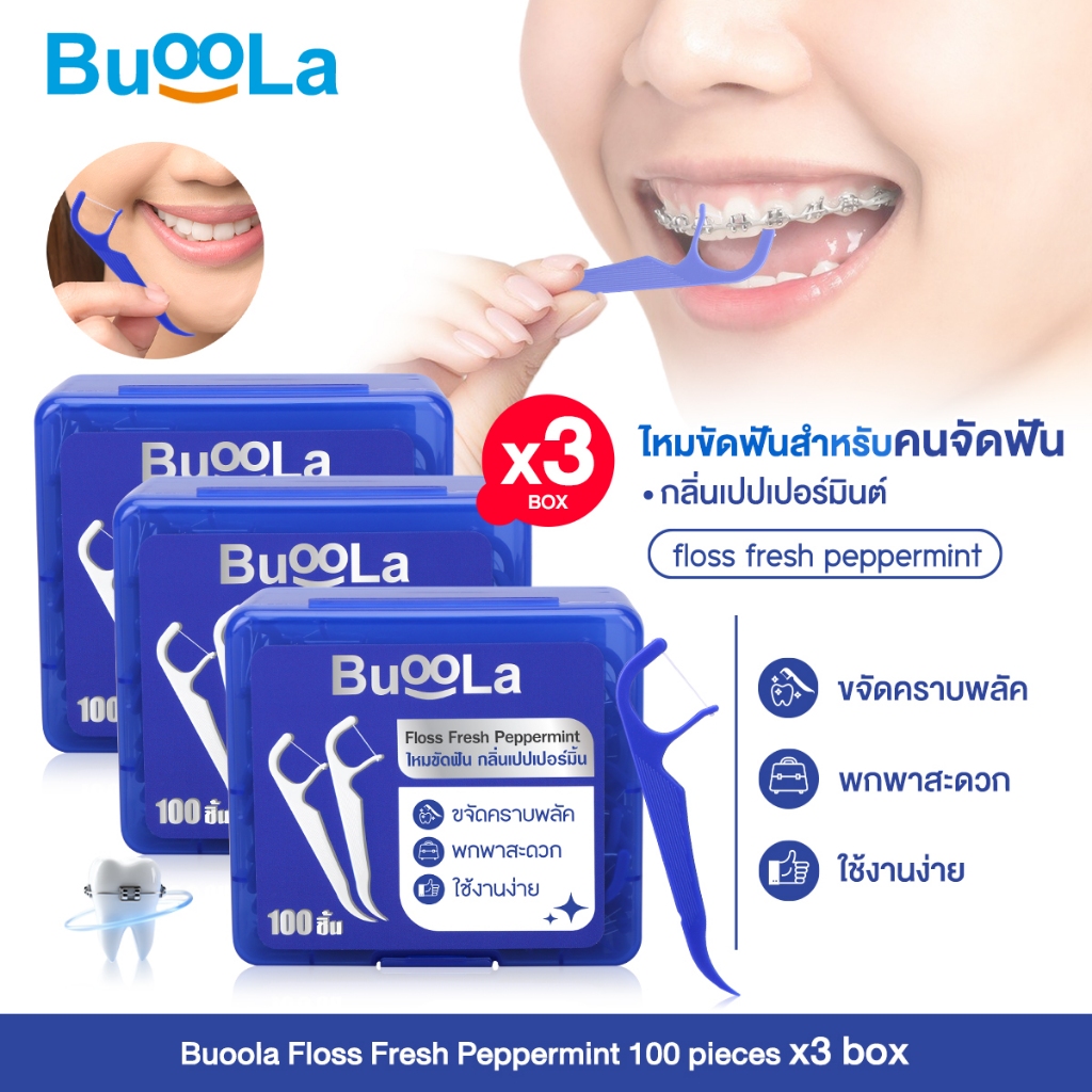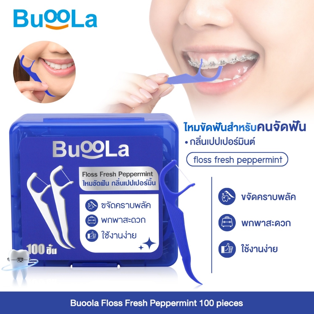 สีใหม่! Buoola ไหมขัดฟันสีน้ำเงิน(สำหรับคนจัดฟัน)กลิ่นเปปเปอร์มินต์ ช่วยขจัดเศษอาหาร เส้นไหมเหนียวทน