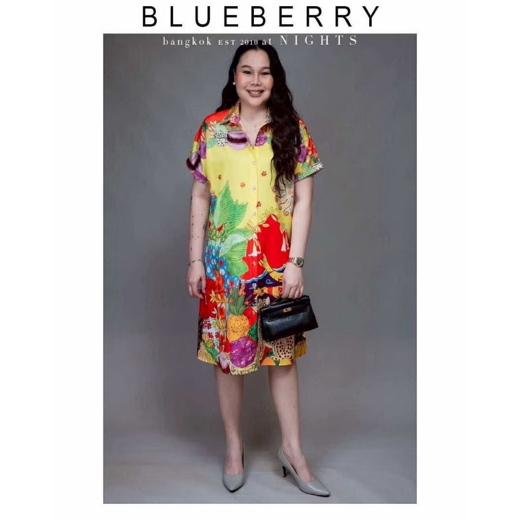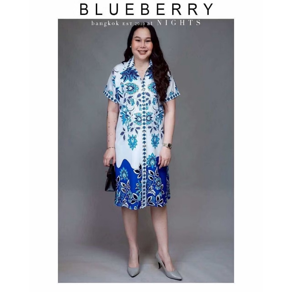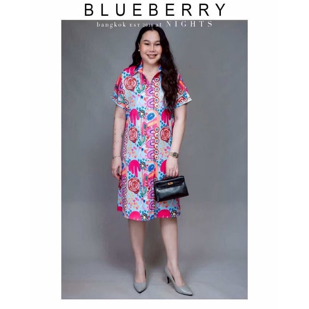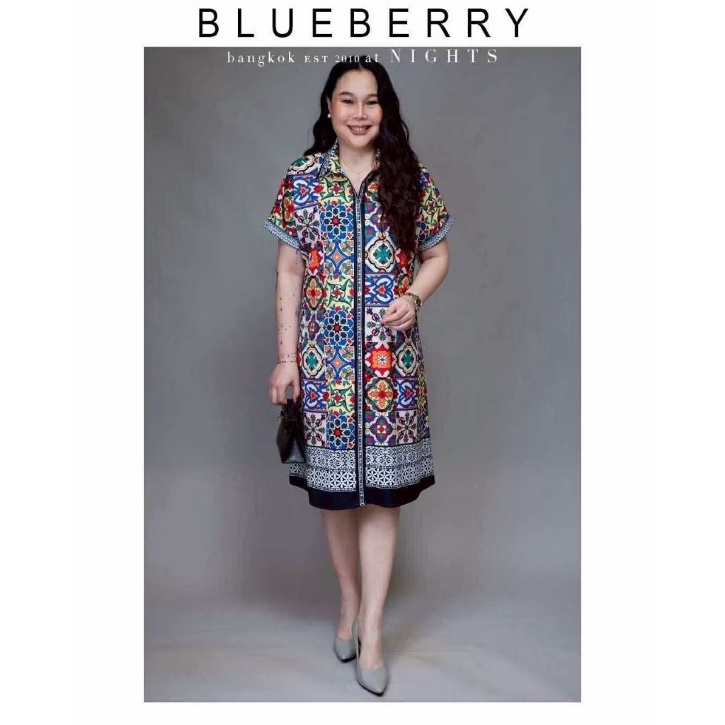 (อก44) 14887 BLUEBERRY NIGHTS ชุดเดรสเชิ้ต ผ้าโพลีเอสเตอร์พิมพ์ลายทั้งตัว เดรสเชิ้ตแขนสั้นกระดุมหน้ายาวตลอด