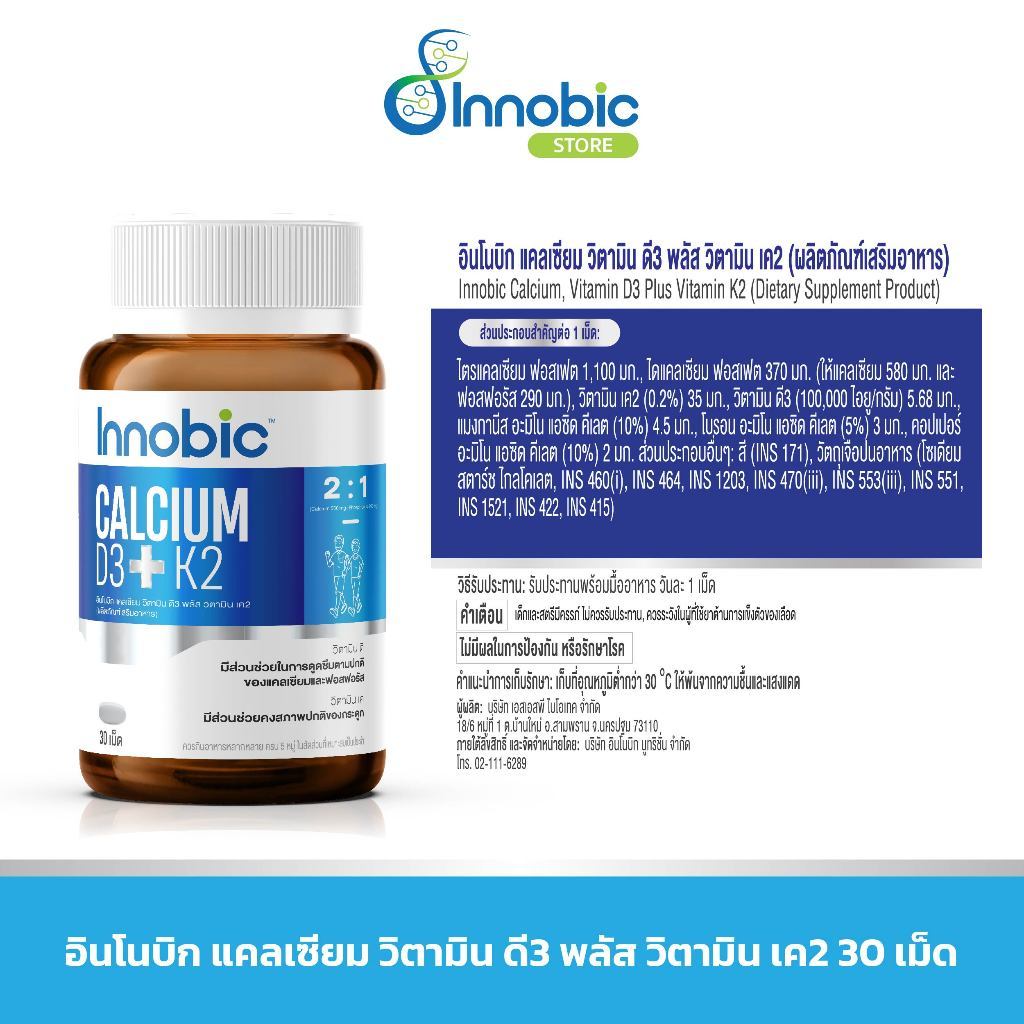 Innobic Calcium Vitamin D3 Plus Vitamin K2 อินโนบิก แคลเซียม วิตามิน ดี3 พลัส วิตามิน เค2 [ 30 เม็ด ] เสริม แคลเซียม บำ
