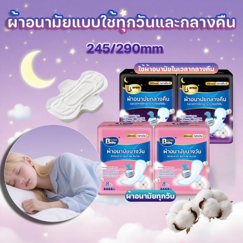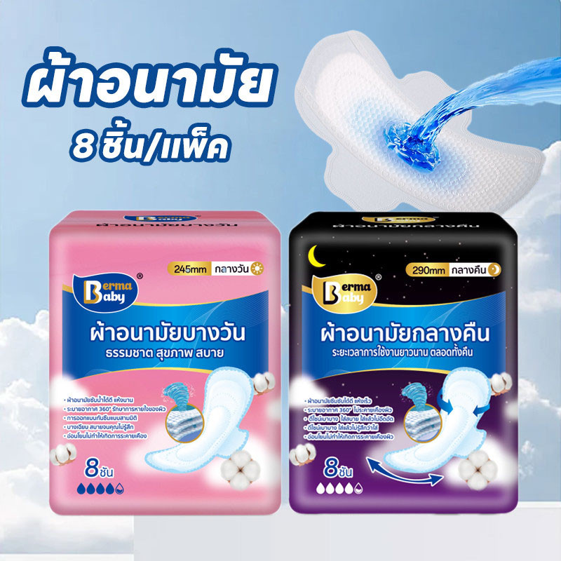 Berma Baby ผ้าอนามัยสุดบางเย็น 8 ชิ้น/แพ็ค ป้องกันการรั่วซึม นุ่มสบาย ใช้งานกลางวัน/กลางคืน 24.5/29 mm