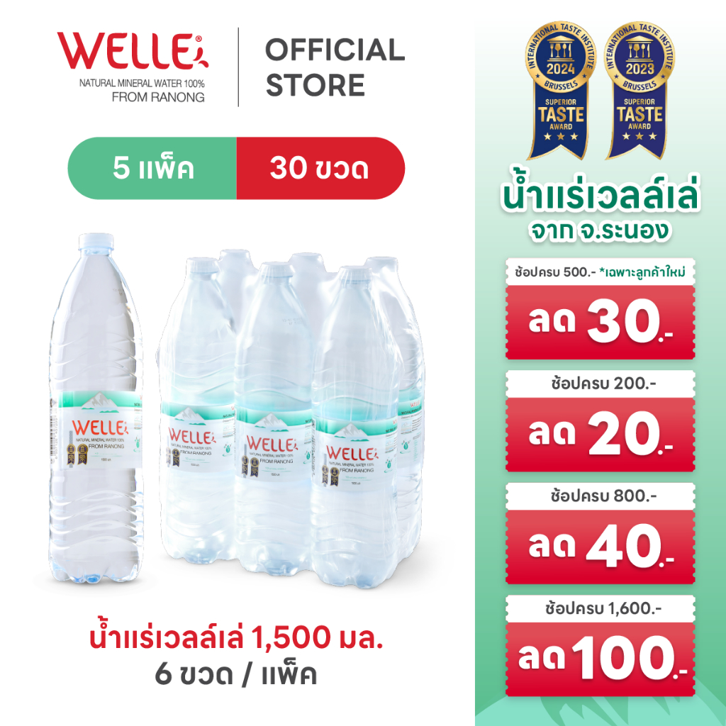 New (30 ขวด) Welle Mineral Water น้ำแร่เวลล์เล่ 1500 มิลลิลิตร 5 แพค จากแหล่งน้ำแร่ระนอง
