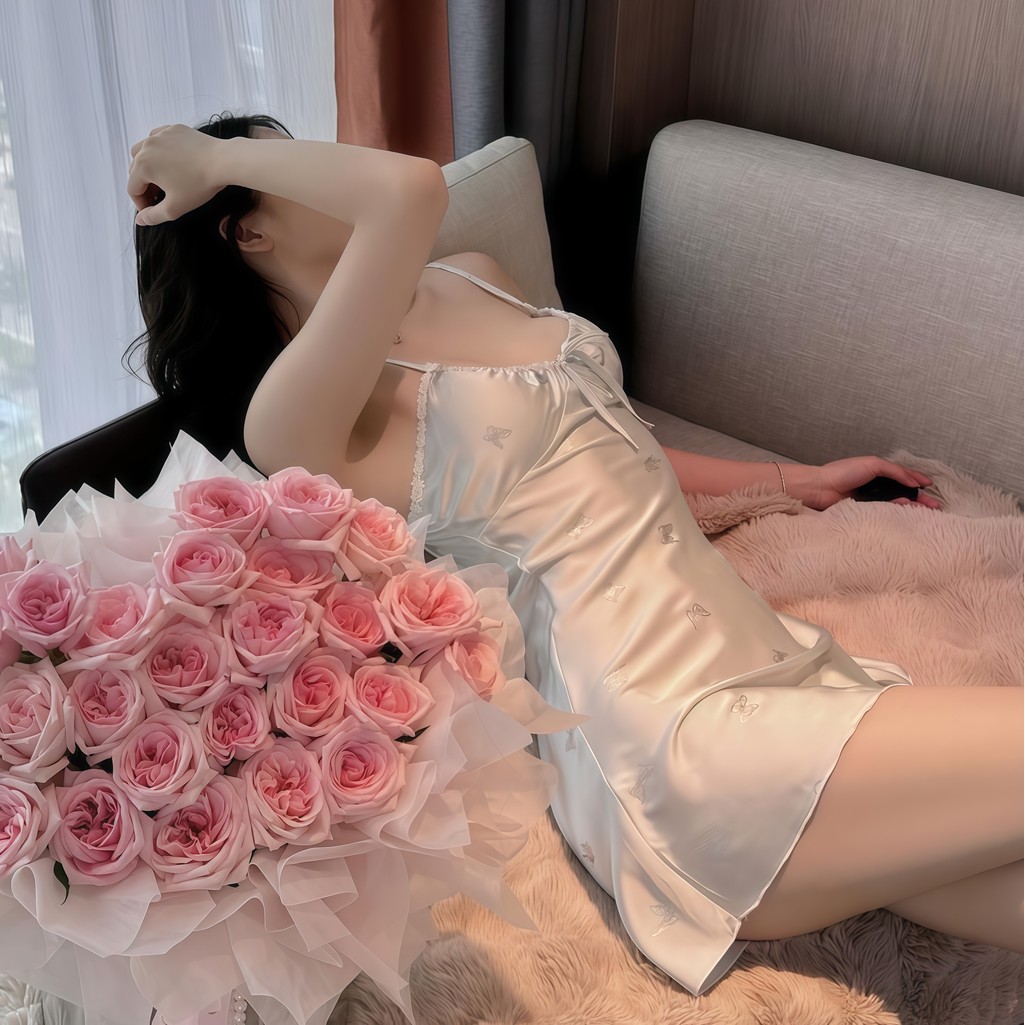 BIG SEXY ชุดนอนเดรสผู้หญิง ชุดนอนผ้าไหมอิตาลี สายเดี่ยวกระโปรงยาว 🐬 M-5XL | 40-100กก. ดีไซน์สุดเก๋ S-395