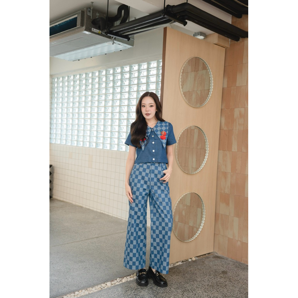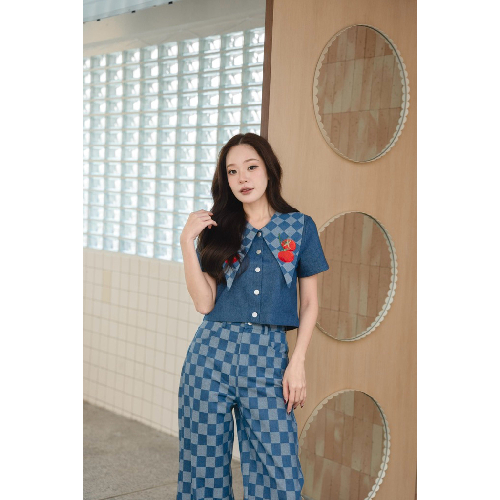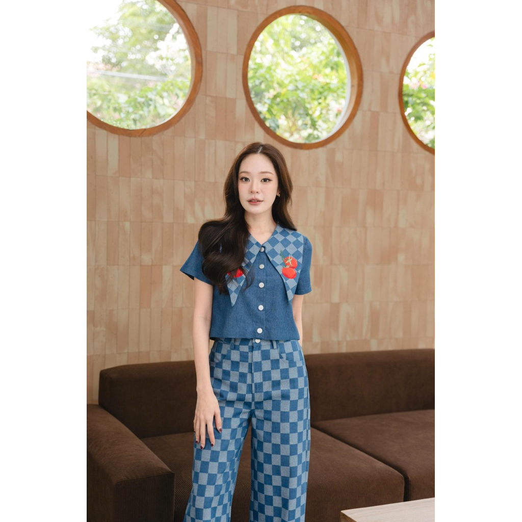 ร185 Tomato Scott ชุดยีนส์คอปกรุ่นใหม่ เสริมความน่ารักด้วยผ้ายีนส์ปักมะเขือเทศที่ปก กับกระเป๋าหลัง