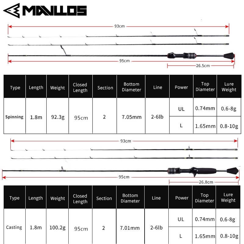 คันเบ็ด Mavllos DELICACY 6 ฟุต คันเบ็ดคันสปิน คาร์บอนไฟเบอร์ น้ําหนักเบา 2 หัว UL/L Lure wt.0.6-8 กรัม Line wt. 2-6lb (เบสเเละสปิ้น)