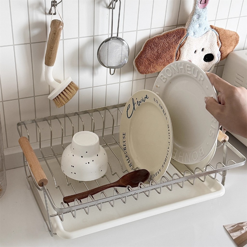 GSlife ชั้นวางจานสแตนเลส พร้อมด้ามจับไม้และถาดน้ำแบบถอดได้ ชั้นวางในครัว