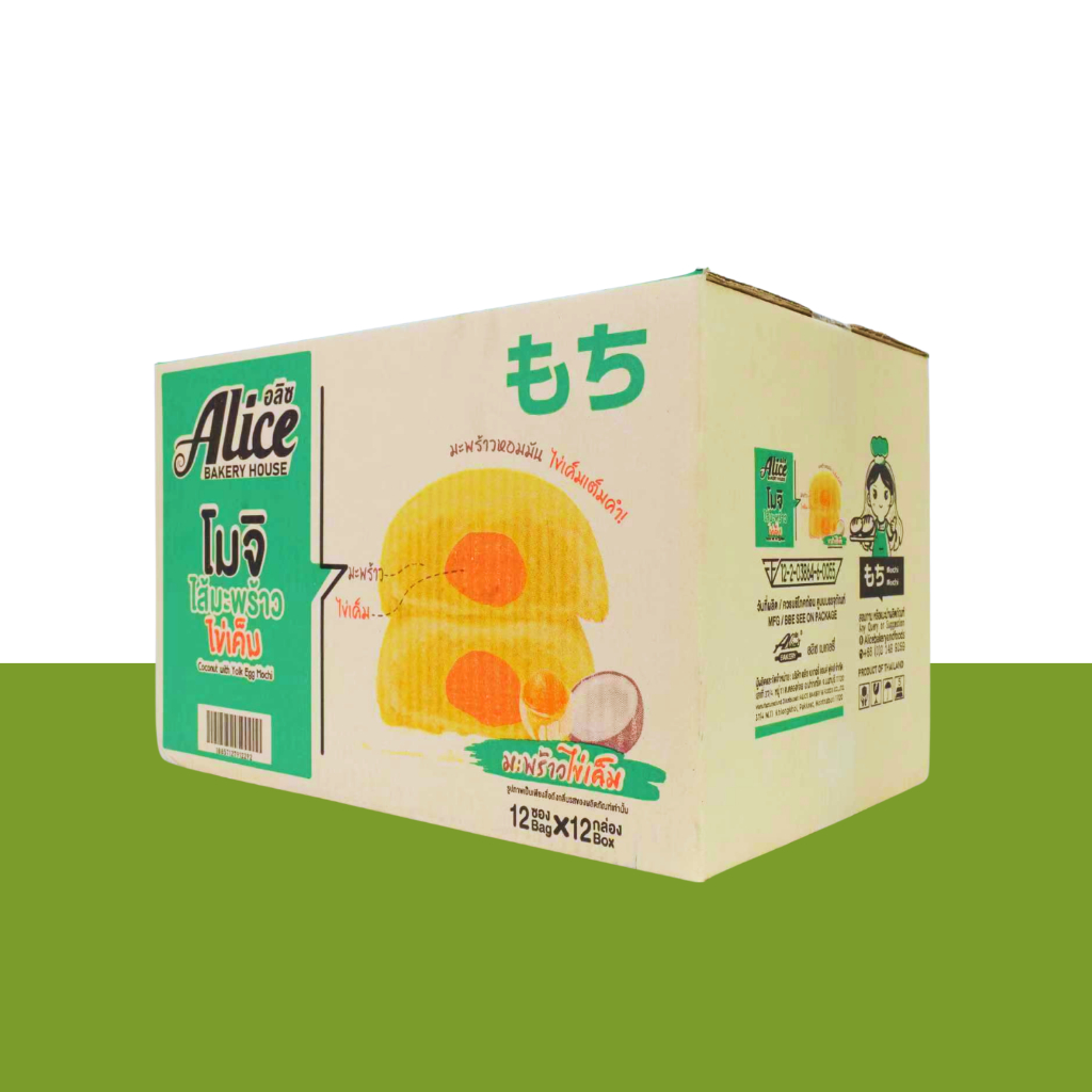 โมจิไส้มะพร้าวไข่เค็ม แบรนด์อลิซ 1 ลัง 12 กล่อง 144 ชิ้น แป้งโมจินุ่มหนึบหอมกลิ่นมะพร้าวแท้