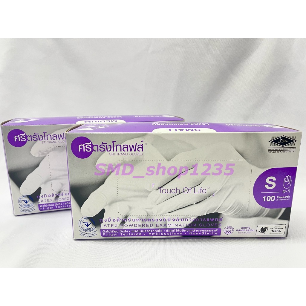ถุงมือศรีตรังโกลฟส์ สีขาว ถุงมือยางธรรมชาติ แบบมีแป้ง/ไม่มีแป้ง ไซส์ S-M (กล่องละ 100 ชิ้น)