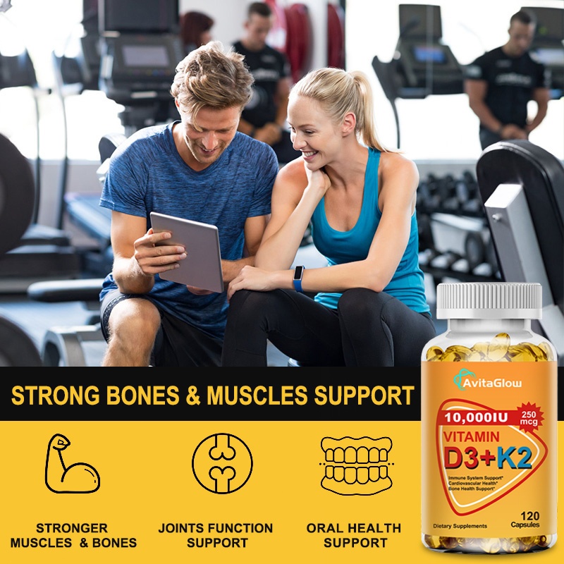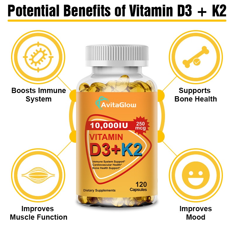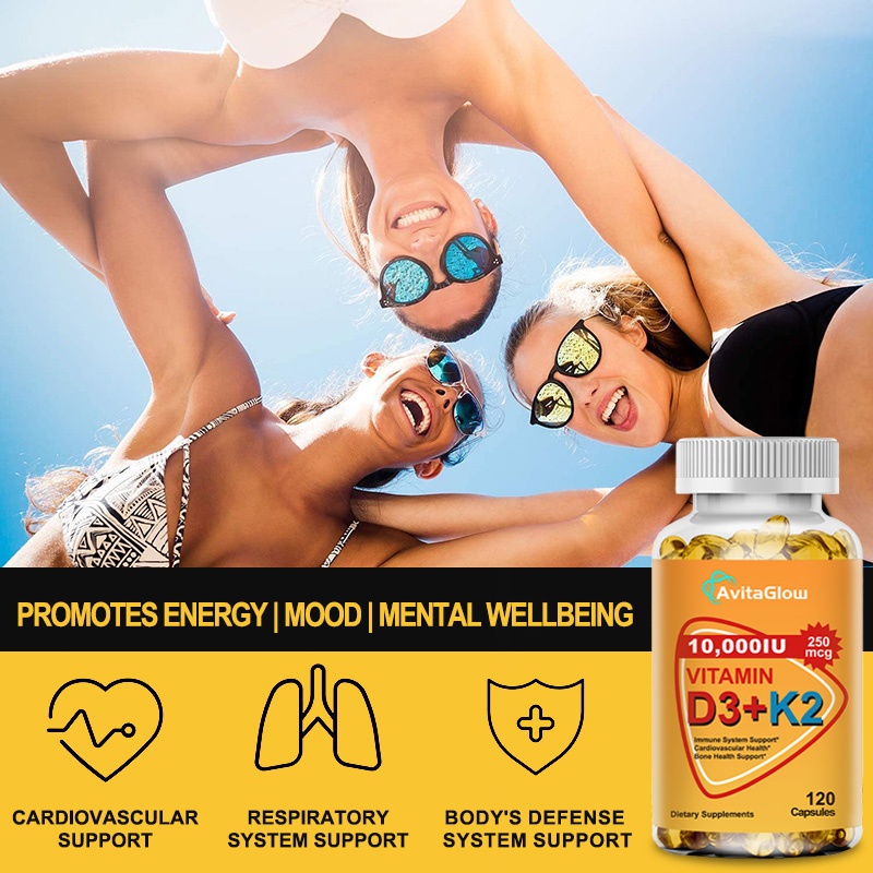 120 แคปซูล AvitaGlow 10000IU Vitamin D3+K2 Capsules วิตามินดี3 + เค2 การแคปซูล ส่งเสริมสุขภาพกระดูกและข้อ ส่งเสริมการดูด