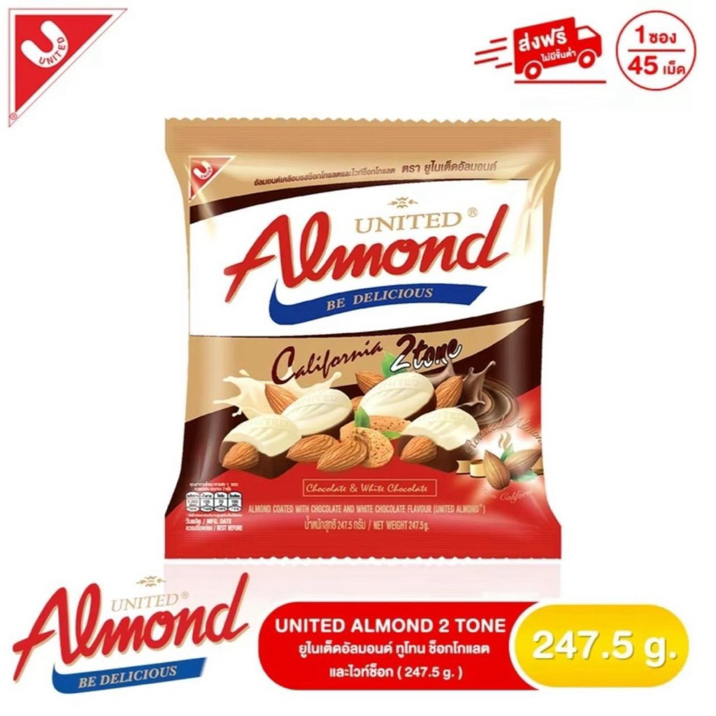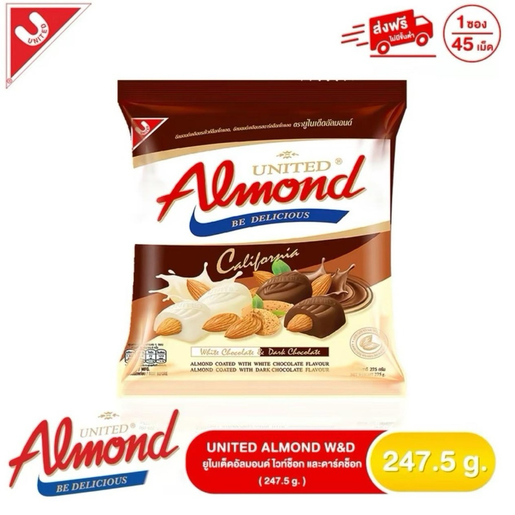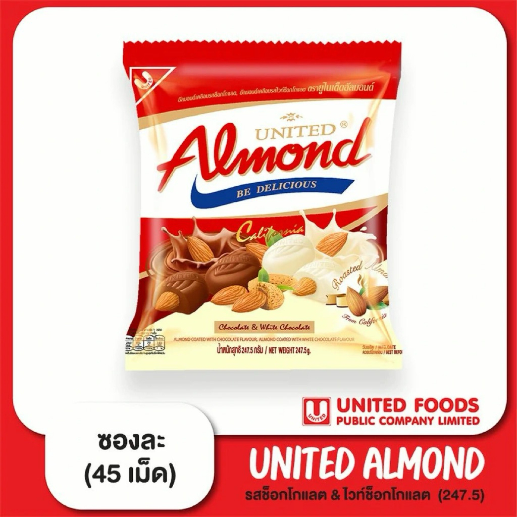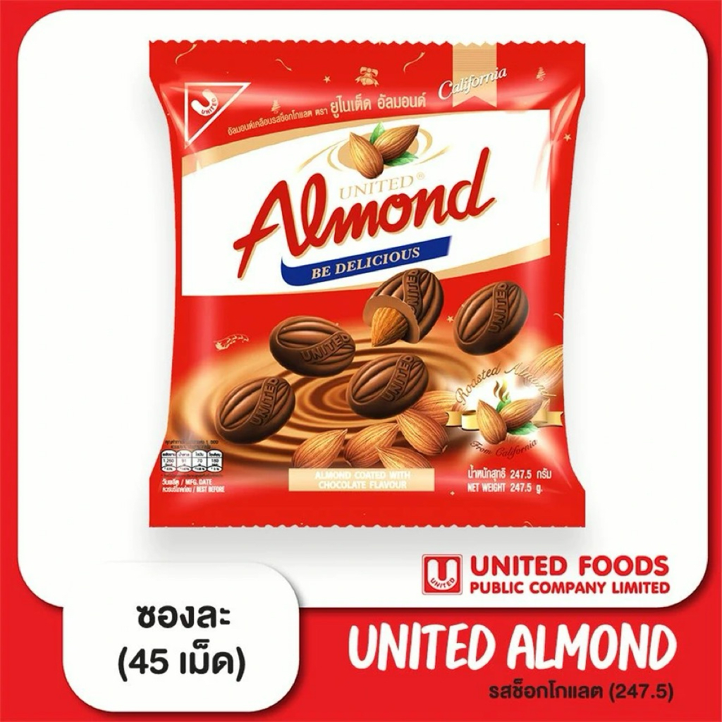 [ 1 ซอง ] UNITED ALMOND ยูไนเต็ดอัลมอนด์เคลือบช็อกโกแลต รุ่นซอง น้ำหนัก 247.5 กรัม/45 เม็ด