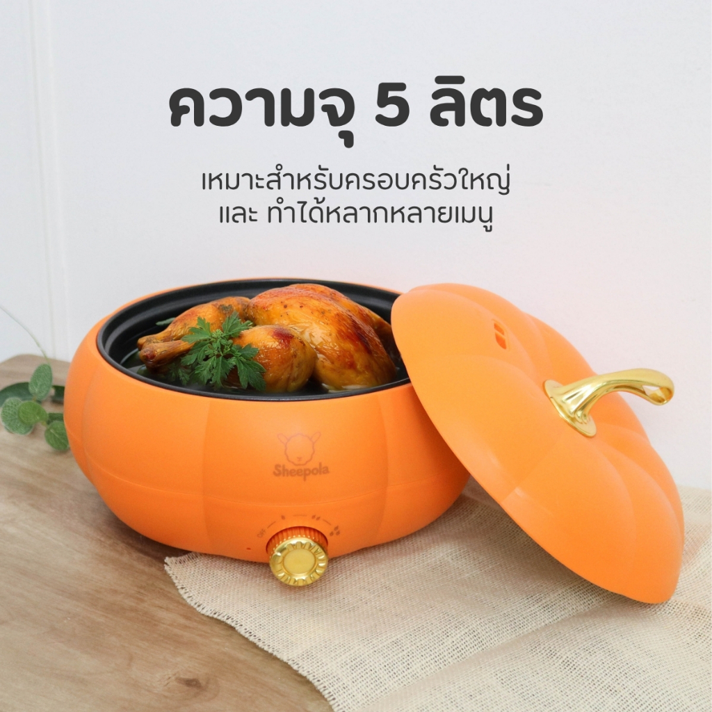 กระทะไฟฟ้า ทรงฟักทอง สีส้ม ความจุ5ลิตร รับประกัน1ปี มีมอก. หม้อไฟฟ้าอเนกประสงค์ ควบคุมอุณหภูมิ 3 ระดับ หม้อชาบูไฟฟ้า