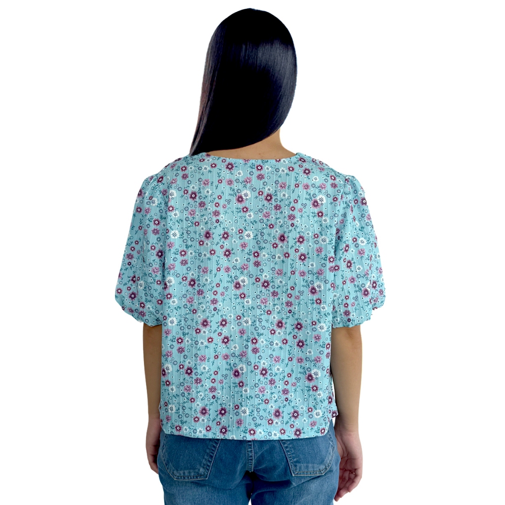 Blue Corner เสื้อเบลาซ์ ลายพิมพ์ดอกไม้ แขนตุ๊กตา สีฟ้า / Puff Sleeve V-Neck Floral Printed T-Shirt (Blue)