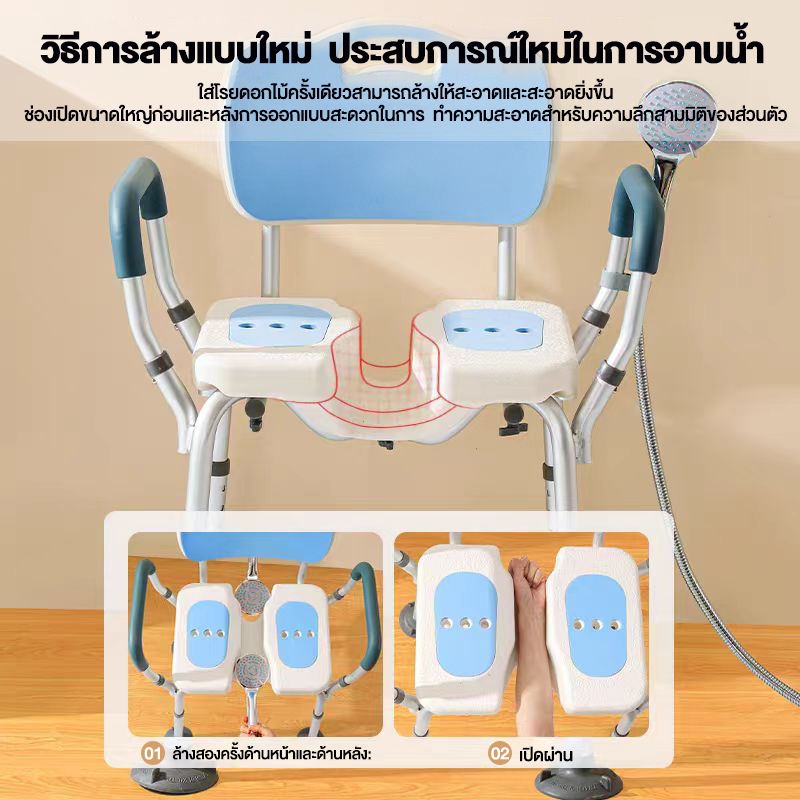 เก้าอี้นั่งอาบน้ำ เก้าอี้ผู้สูงอายุ (โครงสร้างอลูมิเนียม ไม่เป็นสนิม) มีที่เสียบฝักบัว ปรับระดับได้ 38-50CM