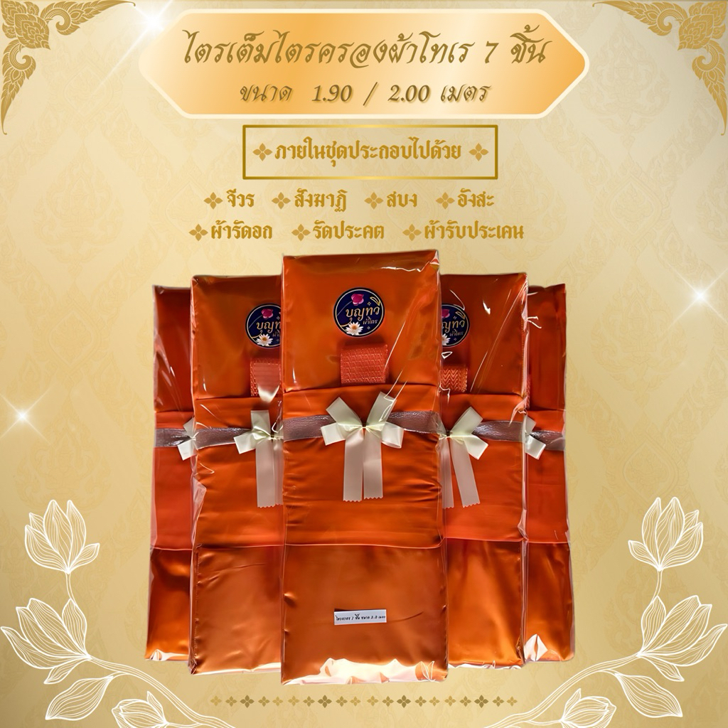 ชุดผ้าไตรจีวรไตรครอง 7 ชิ้น เนื้อผ้าโทรเร ใช้สำหรับถวายพระสงฆ์ในพิธีต่างๆมีขนาด 1.9 เมตรกับ 2.0 เมตร จำนวน 1 ชุด