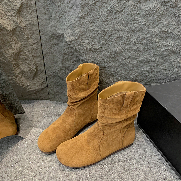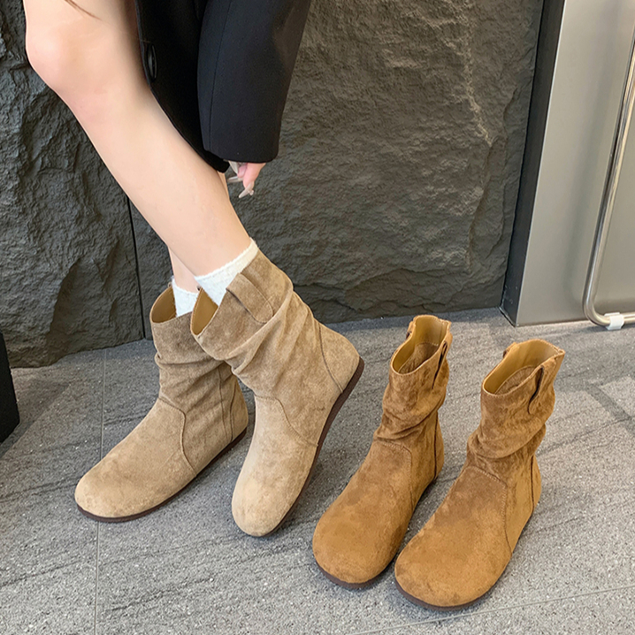 รองเท้าบูทหุ้มข้อหัวกลมหนังกลับ วัสดุหนังวัวพื้นนุ่ม การออกแบบจีบ ทันสมัยและทนทานต่อการสึกหรอ
