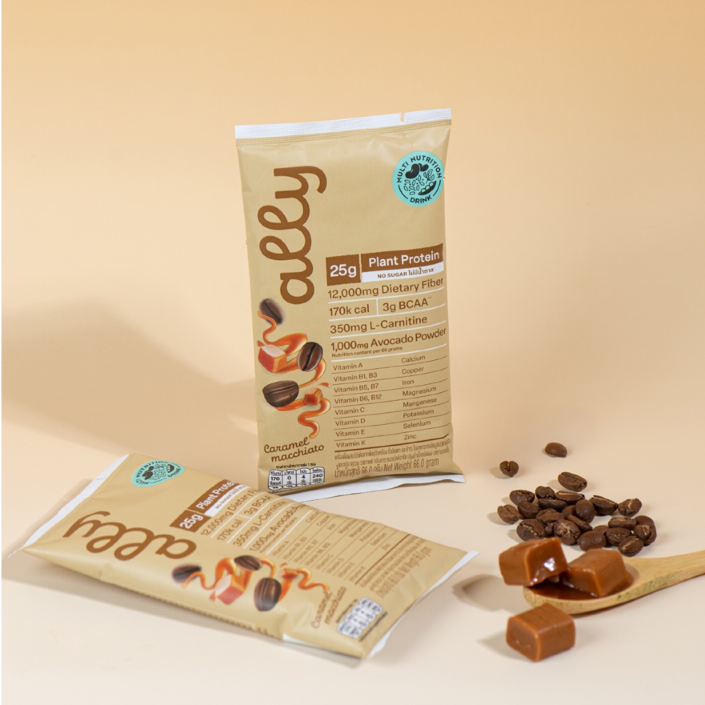Ally powder Caramel macchiato ออลลี่ พาวเดอร์ คาราเมล มัคคิอาโต้ โปรตีนพืช ทดแทนมื้ออาหาร 1 กล่อง 6 ซอง