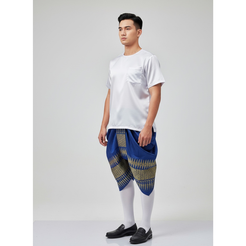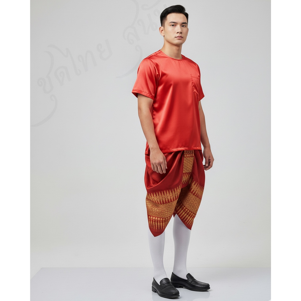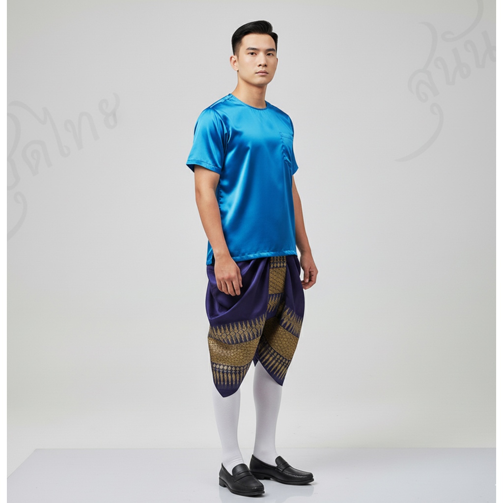 ชุดไทย ชุดไทยลำลอง ชุดพื้นเมืองชาย โจงกระเบนผ้าภูพิงค์+เสื้อคอกลม