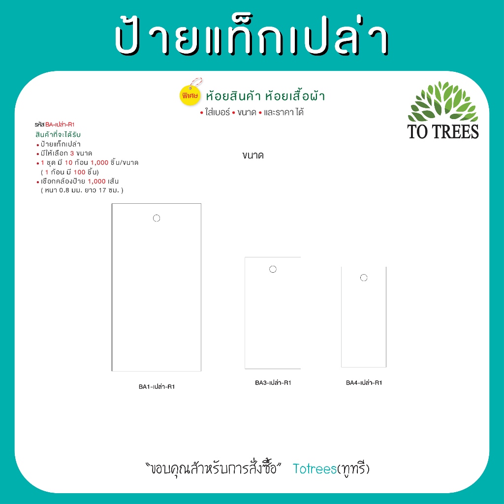 Totrees ป้ายแท็กเปล่า มีให้เลือก 3 ขนาด จำนวน 1,000 ชิ้น เชือกคล้องป้าย ยาว 17 ซม. จำนวน1,000 เส้น รหัส BA-เปล่า-R1