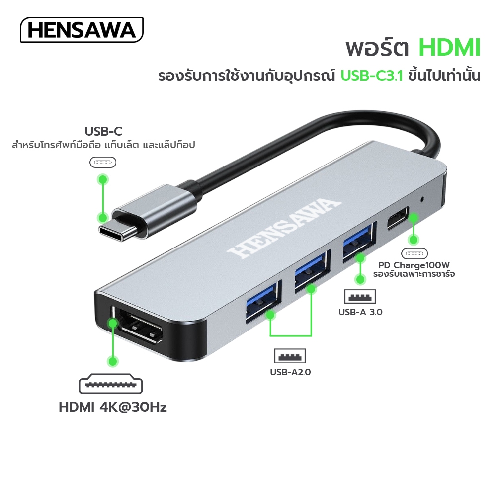 HENSAWA รุ่น PC641 HUB Type C 5 in 1 รองรับ PD100W USB3.0 USB2.0 USB C HDMI 4K 30HZ SD/TF Card อะแดปเตอร์ฮับ