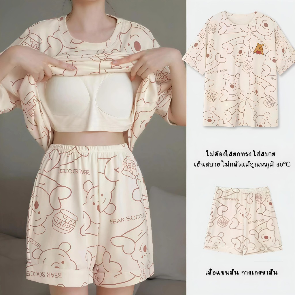 ชุดนอนผู้หญิง 2 ชิ้น มีบราในตัว ทรงหลวม ลายน่ารัก บางเบา นุ่มละมุน ระบายอากาศได้ดี ไม่ร้อน พร้อมส่ง