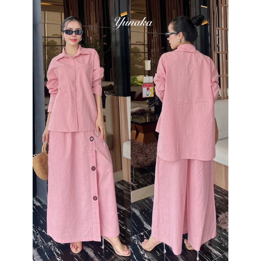 เซต2ชิ้น เสื้อเชิ้ตกระดุมหน้าแขนยาวกระเป๋าหน้าอก มาคู่กับกระโปรงกางเกงตัวยาวเอวยางยืดสม้อคหลัง