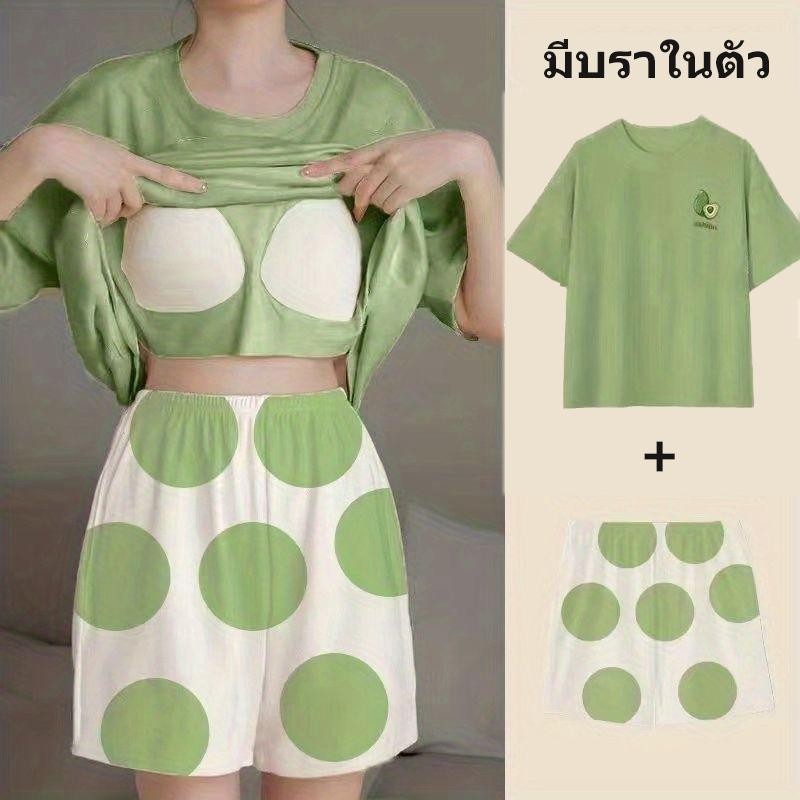 Anata ชุดนอน ผ้าเด้งนิ่ม พร้อมส่งชุดนอนแขนสั้นขาสั้นคอกลมมีบราในตัว Lady ผู้หญิง