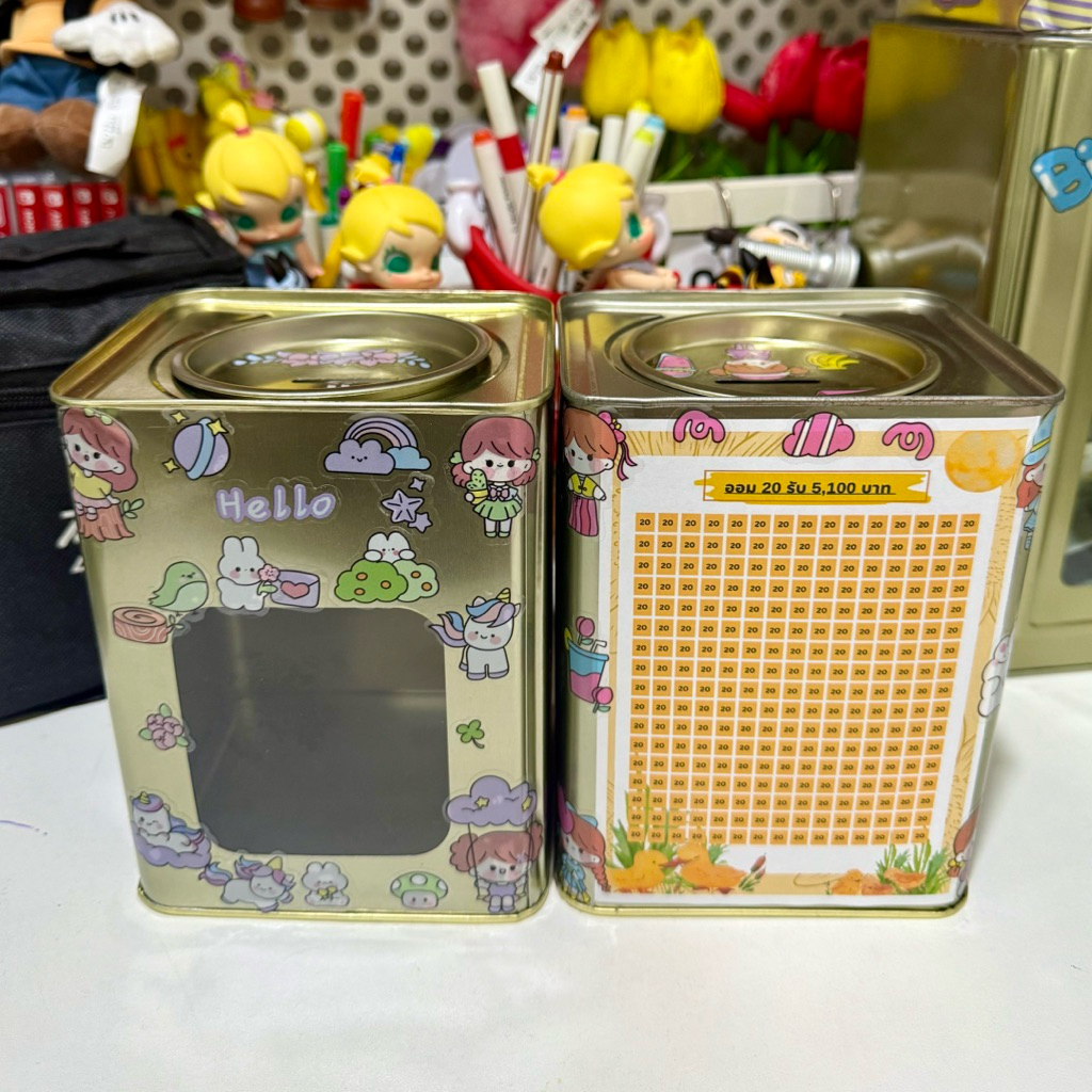 กระปุกออมสินปี๊บจิ๋ว สูง 15 cm (มีฝาหน้าต่าง) พร้อมตารางออม สติกเกอร์ ซองกันชื้น