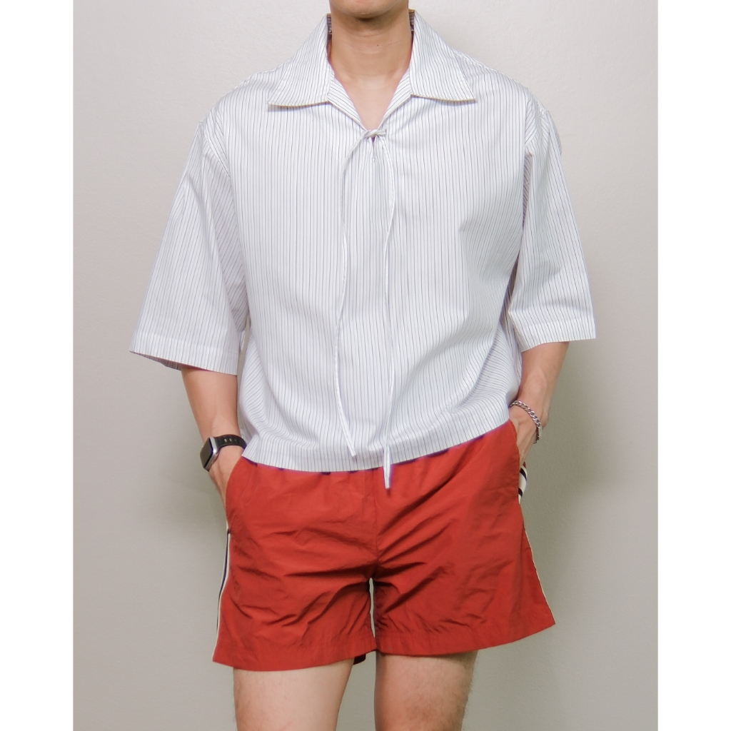 COMPOSE. - Fisherman Cropped Shirt in Striped White | เสื้อเชิ้ตแขนสั้น คอเปิด พร้อมเชือกผูก ลายริ้วสีขาว