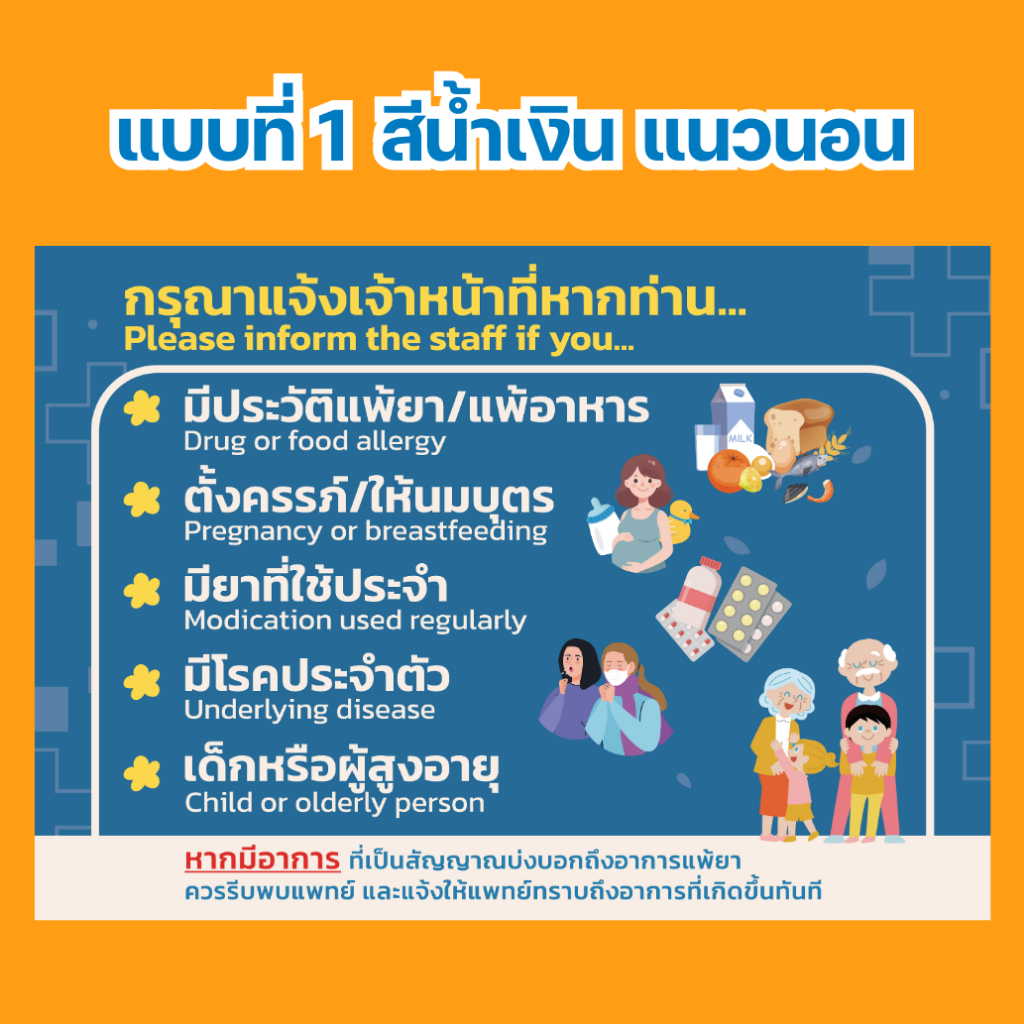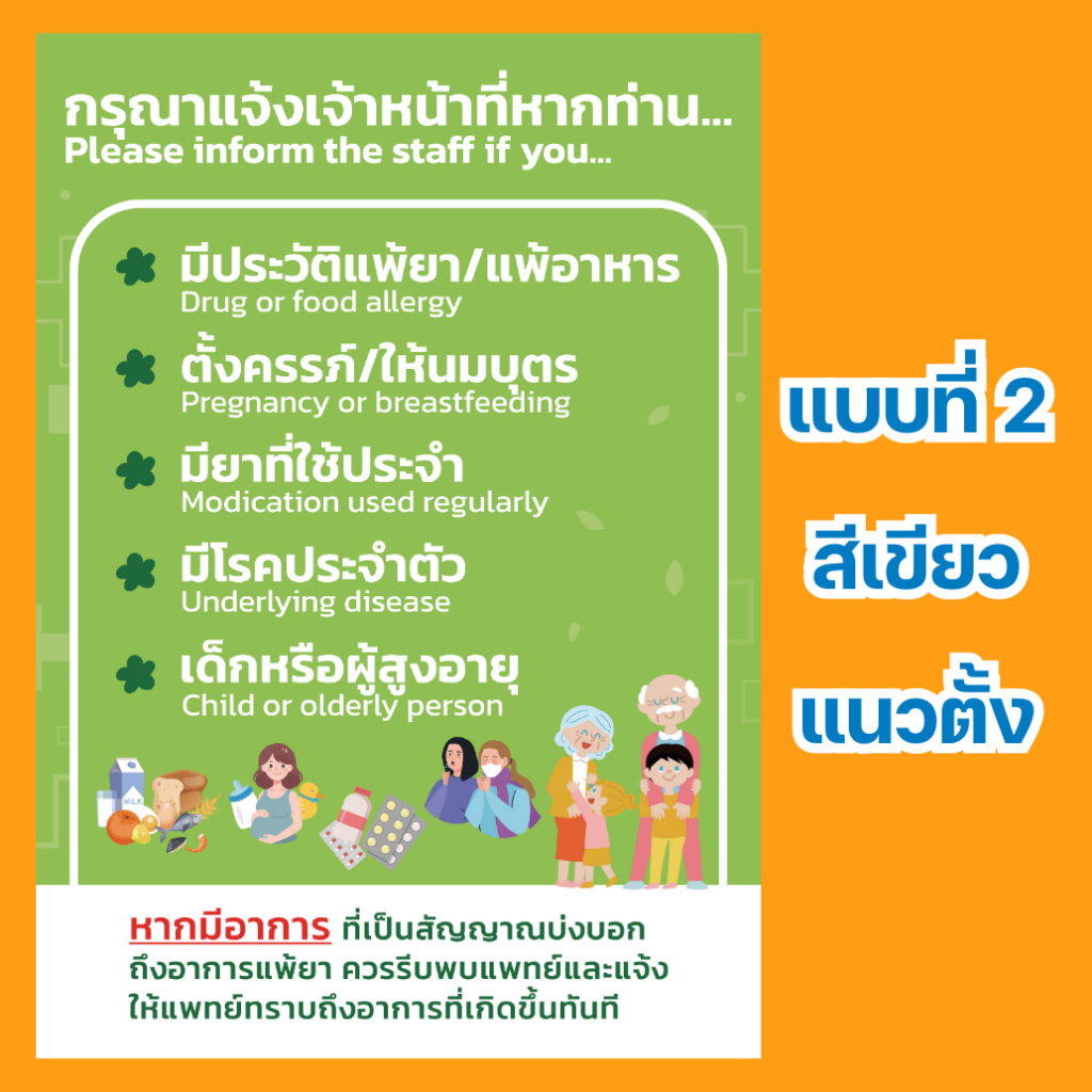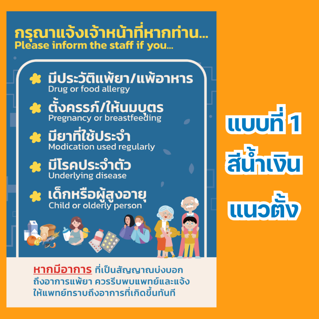 ป้ายแจ้งการแพ้ยา กรุณาแจ้งเจ้าหน้าที่ แจ้งเภสัช หากท่านแพ้ยาโปรดแจ้ง เคลือบพลาสติกแข็ง กันน้ำ มี 3 ขนาด A5 , A4 และ A3