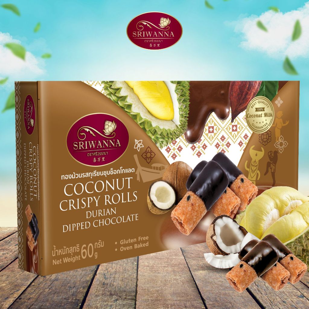 ศรีวรรณา ทองม้วนรสทุเรียนชุบช็อกโกแลต 60 กรัม SRIWANNA Coconut Crispy Rolls Durian Dipped Chocolate 60 g.