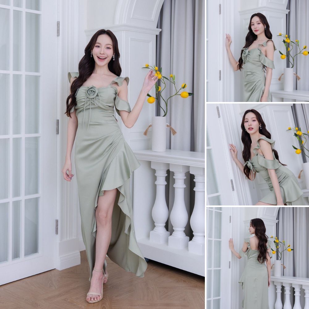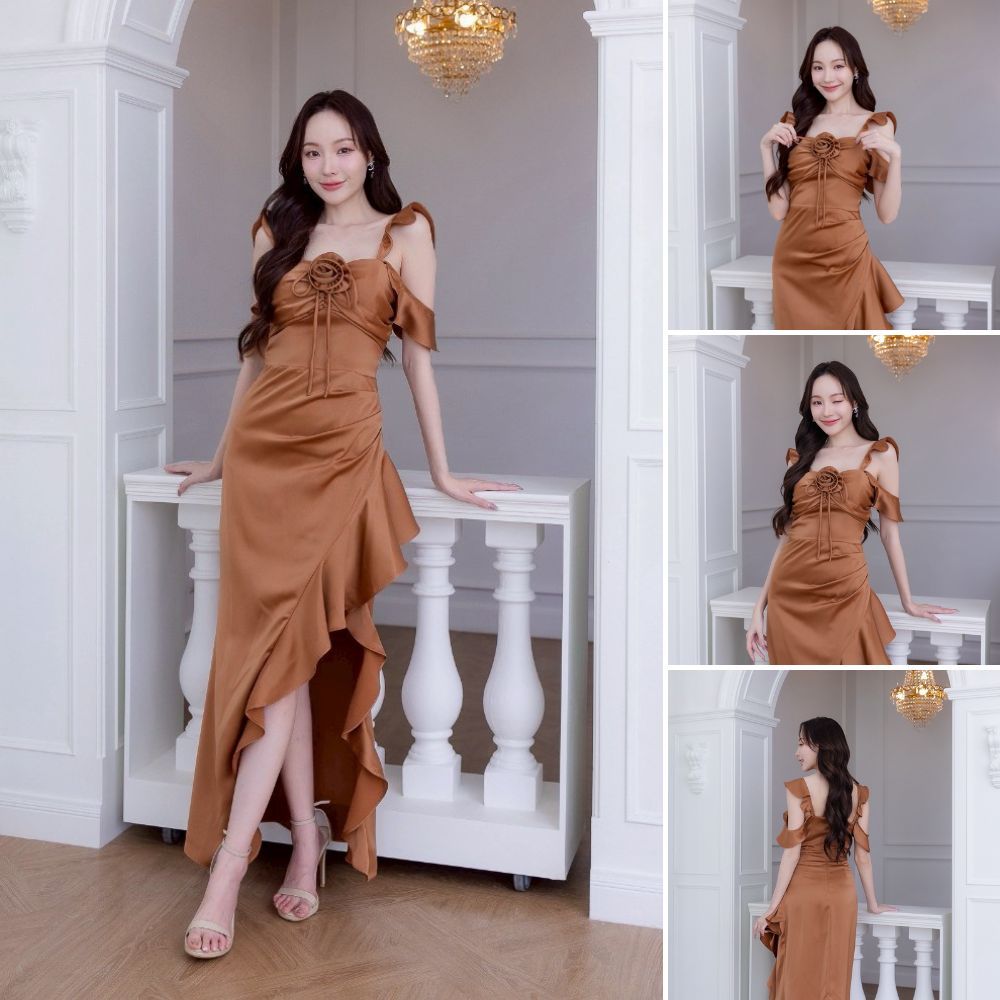 เดรสยาว ชุดออกงาน VINA DRESS พรีเมี่ยม เครปซาติน สายเกลียวหรู แถม ดอกไม้ ชุดราตรีเรียบหรู พร้อมส่ง