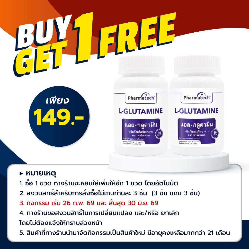 [ซื้อ 1 แถม 1] แอล-กลูตามีน ฟาร์มาเทค L-Glutamine Pharmatech แอลกลูตามีน กลูตามีน Glutamine