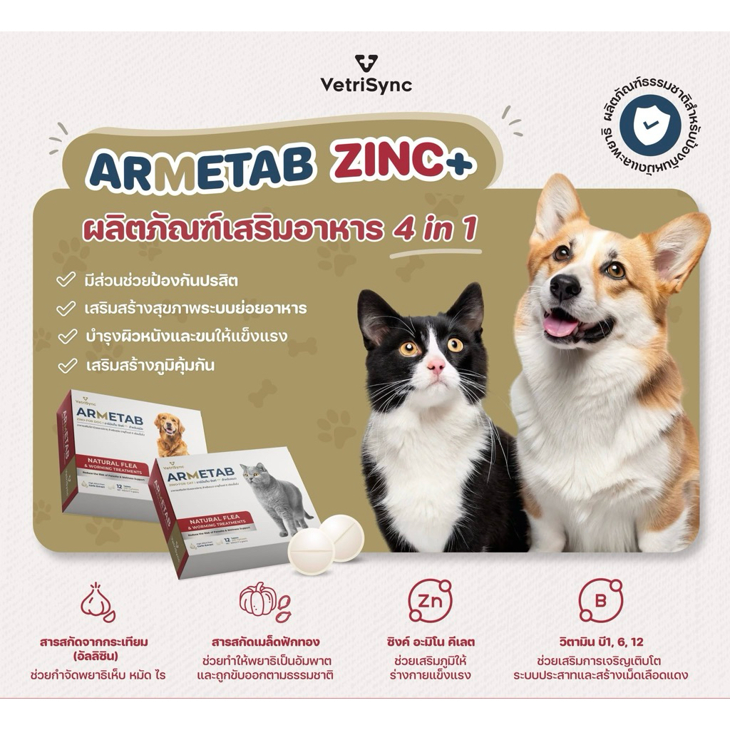 Armetab Zinc+ แบบเม็ด ป้องกันพยาธิ เห็บหมัด ไร โรคผิวหนัง สุนัข-แมว (ครอบคลุม 1 เดือน)