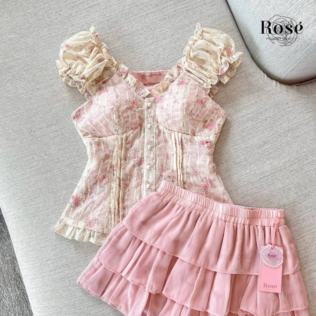 Rosé Set เสื้อเสื้อฉลุลายโทนครีมชมพูดีเทลระบายรอบคอและแขน