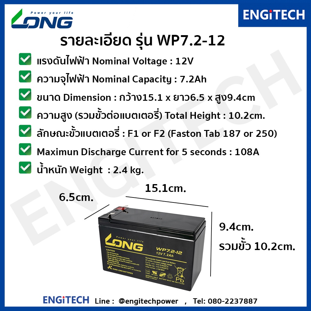 LONG แบตเตอรี่ แห้ง WP7.2-12 ( 12V 7.2AH )สำรองไฟ ฉุกเฉิน รถไฟฟ้า ระบบ อิเล็กทรอนิกส์ UPS