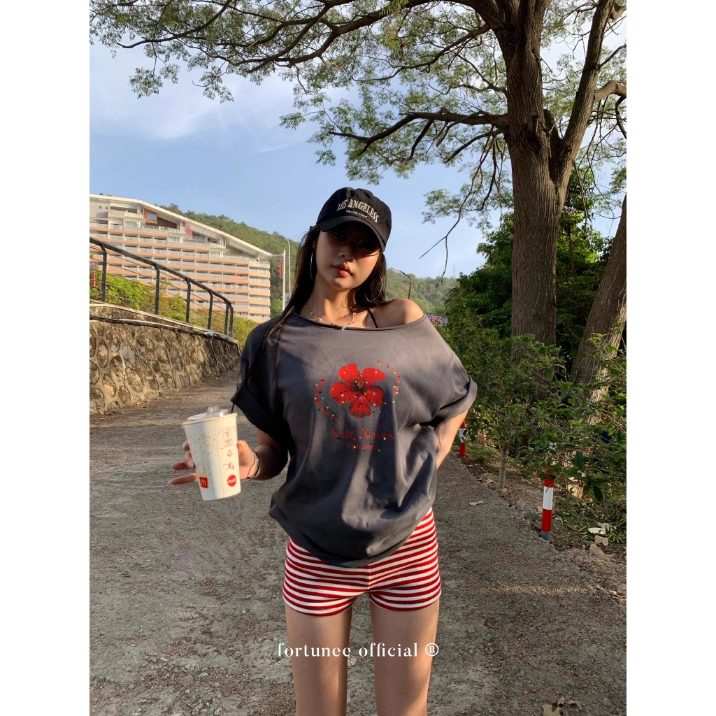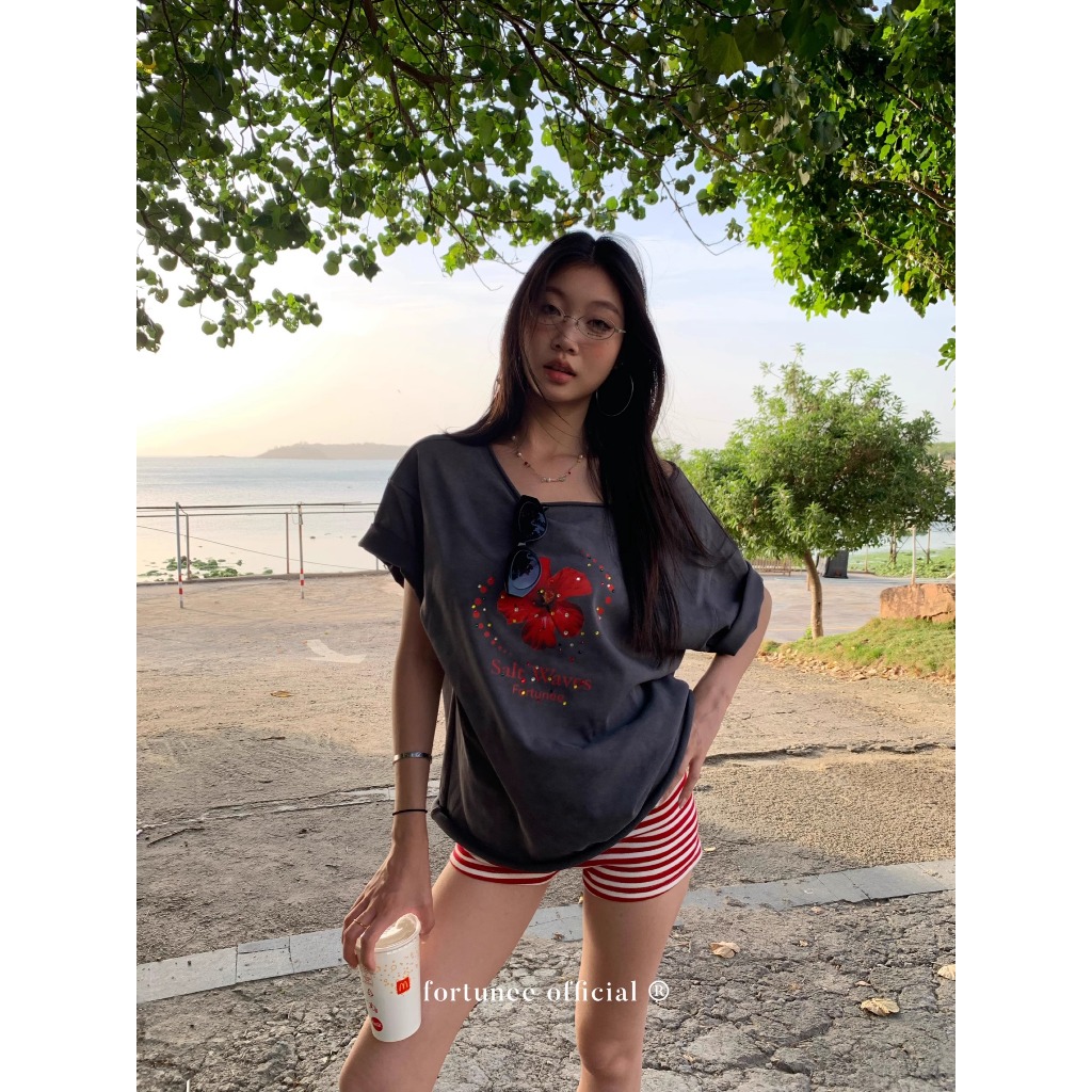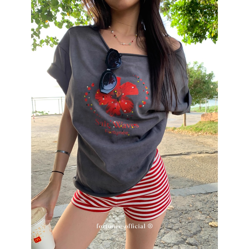 ❣Fortunee ❣ เสื้อทรงหลวม ลายดอกชบา แต่งเพชรหลากสี ไหล่เฉียง เท่แบบวินเทจ ผ้าฟอกสี
