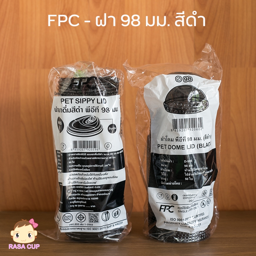 CHM-ฝา98-100 : ฝาพลาสติก PET สำหรับแก้วปาก 98 มม. ยี่ห้อ FPC มีแบบฝาให้เลือกด้านใน บรรจุ 100 ชิ้น