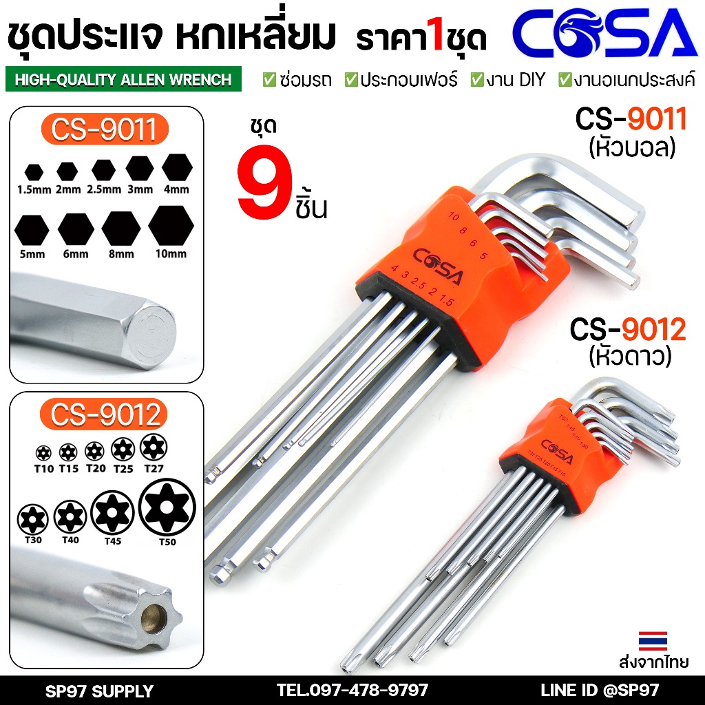 COSA ชุดประแจ หกเหลี่ยม เหล็กแข็งเกรด (CR-V) ประแจแอล ตรง 9 นิ้ว หัวบอล/หัวดาว/หกเหลี่ยม (ยาว)